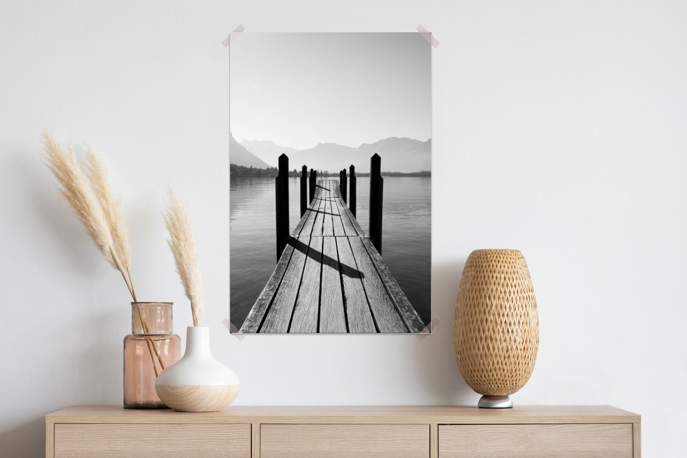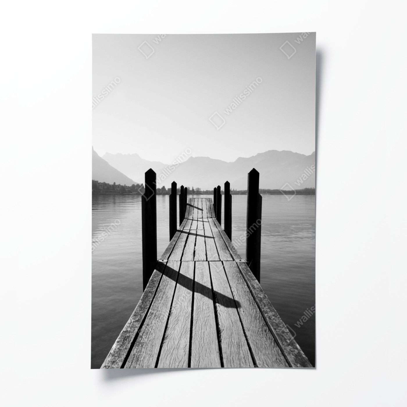 Plakat Spokojny pomost nad jeziorem w czerni i bieli