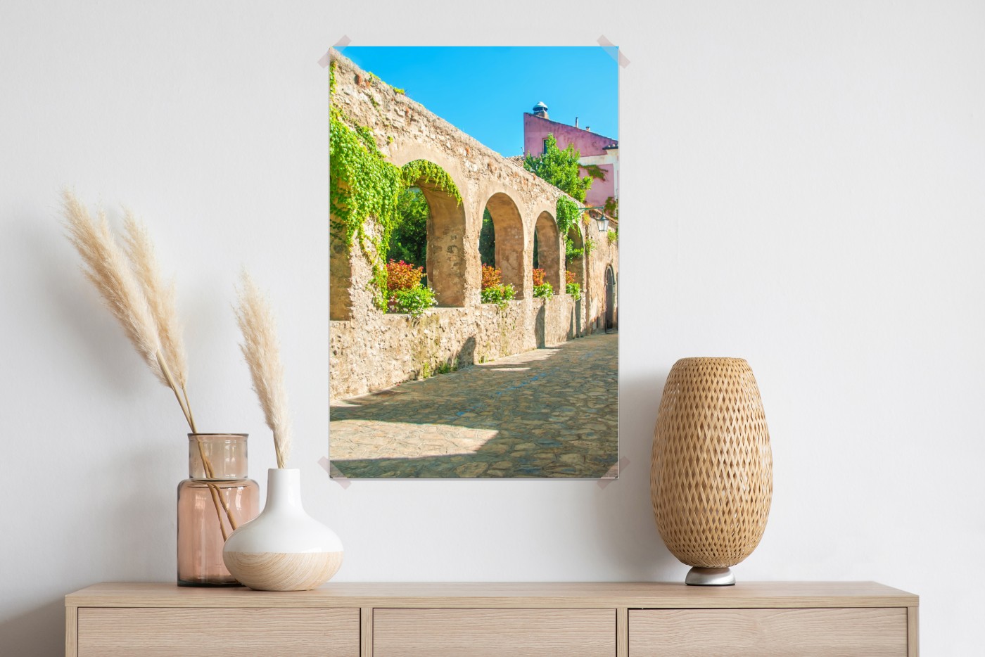 Wprowadź nadmorski urok Wybrzeża Amalfi do wnętrza dzięki tej słonecznej scenerii z Ravello, z kamiennymi łukami, bluszczem i kolorowymi kwiatami.WięcejMniej