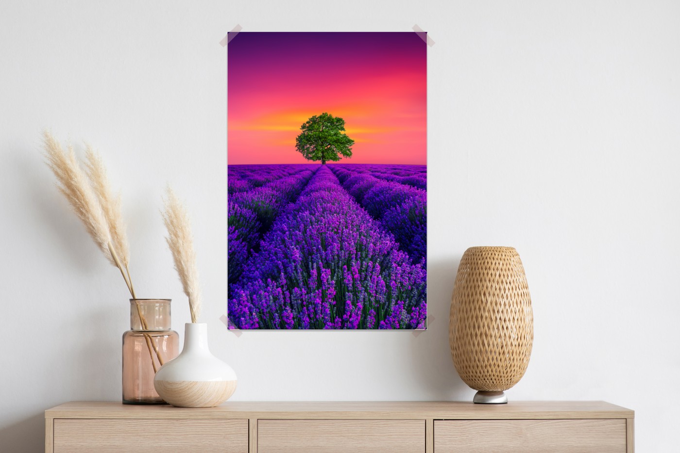 Plakat Pole lawendy o zachodzie słońca z samotnym drzewem
