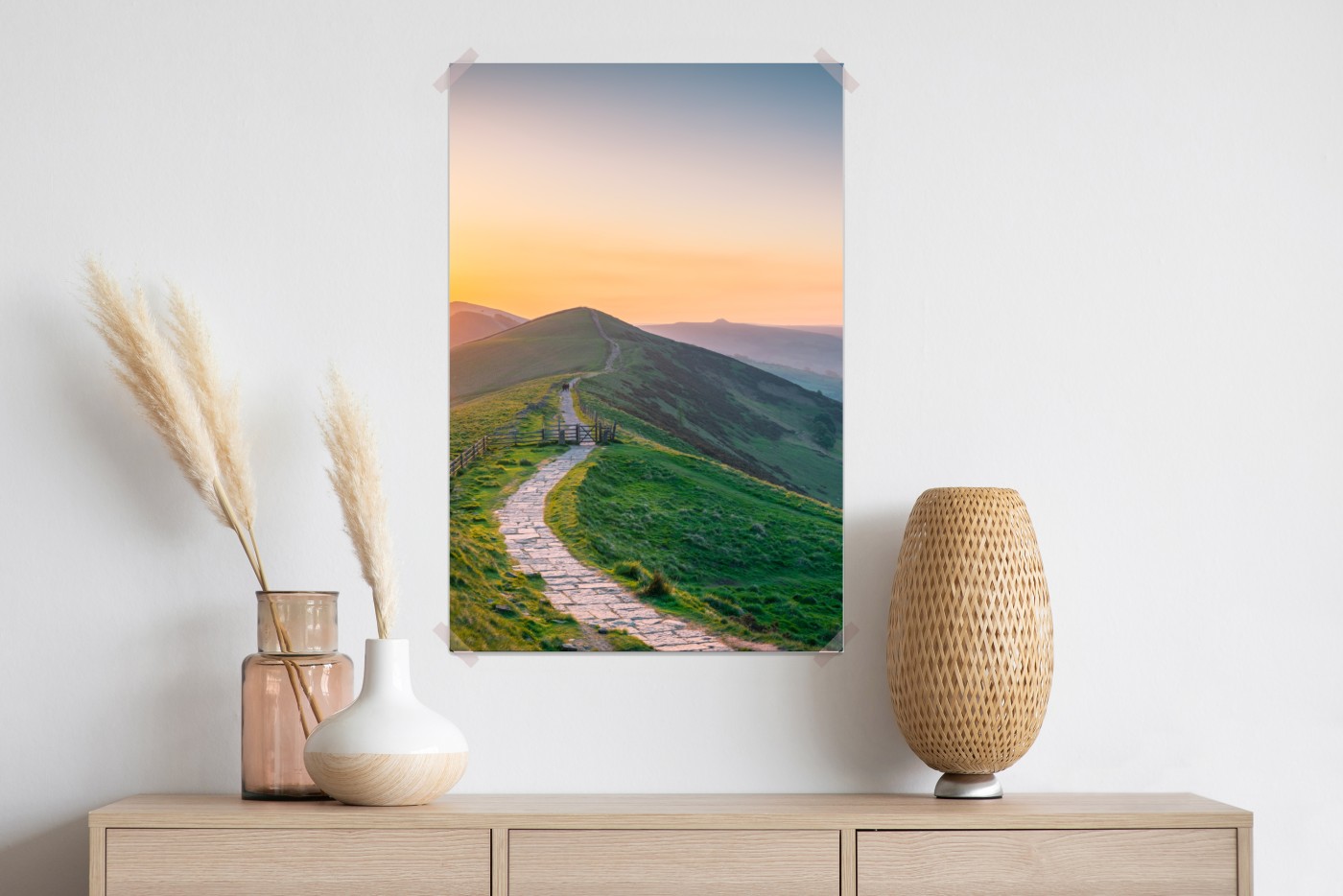 Plakat Wschód słońca nad zielonymi wzgórzami z kamienną ścieżką