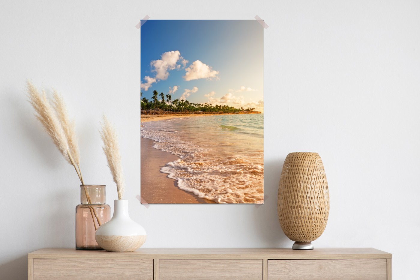 Plakat Tropikalny zachód słońca na plaży z sylwetkami palm
