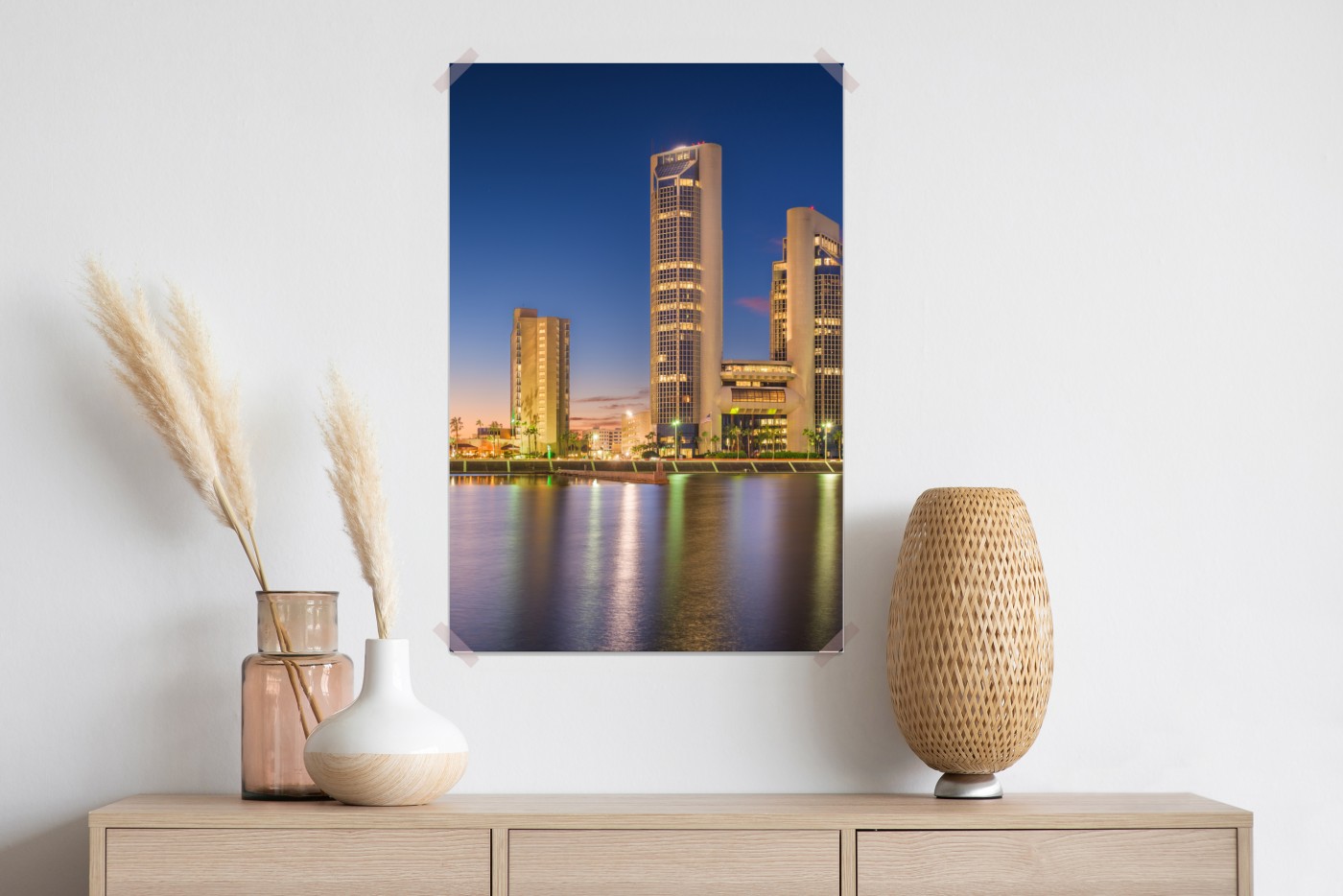 Odkryj spokojne piękno panoramy Corpus Christi o zmierzchu z lśniącymi odbiciami i miejskim klimatem, idealne do ozdobienia wnętrza.WięcejMniej