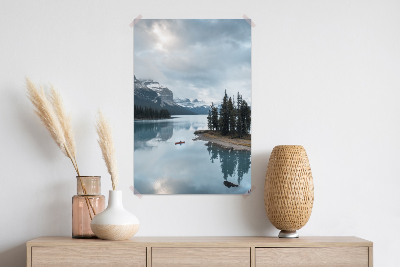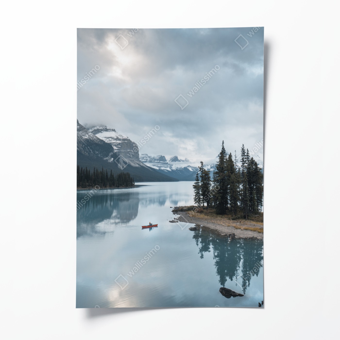 Plakat Spokojne alpejskie jezioro z wyspą i kajakiem
