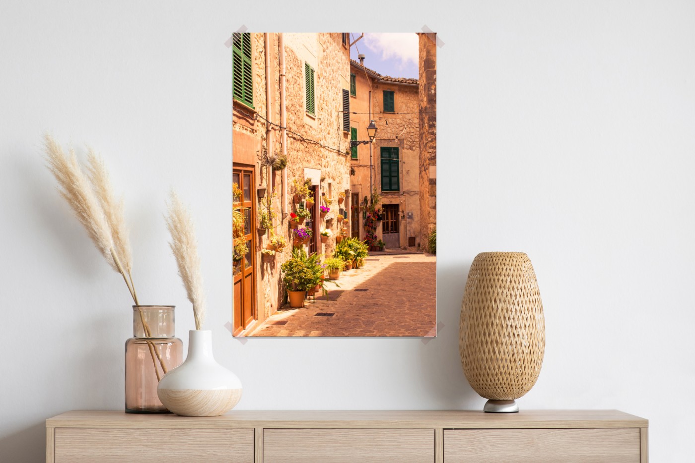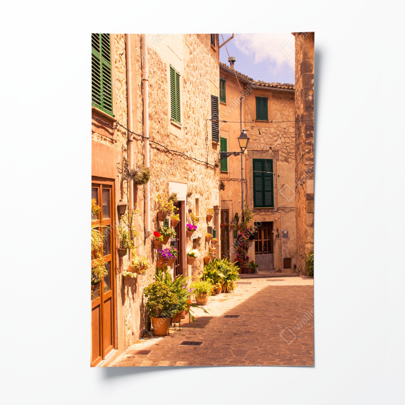 Plakat Słoneczna uliczka śródziemnomorska z doniczkami