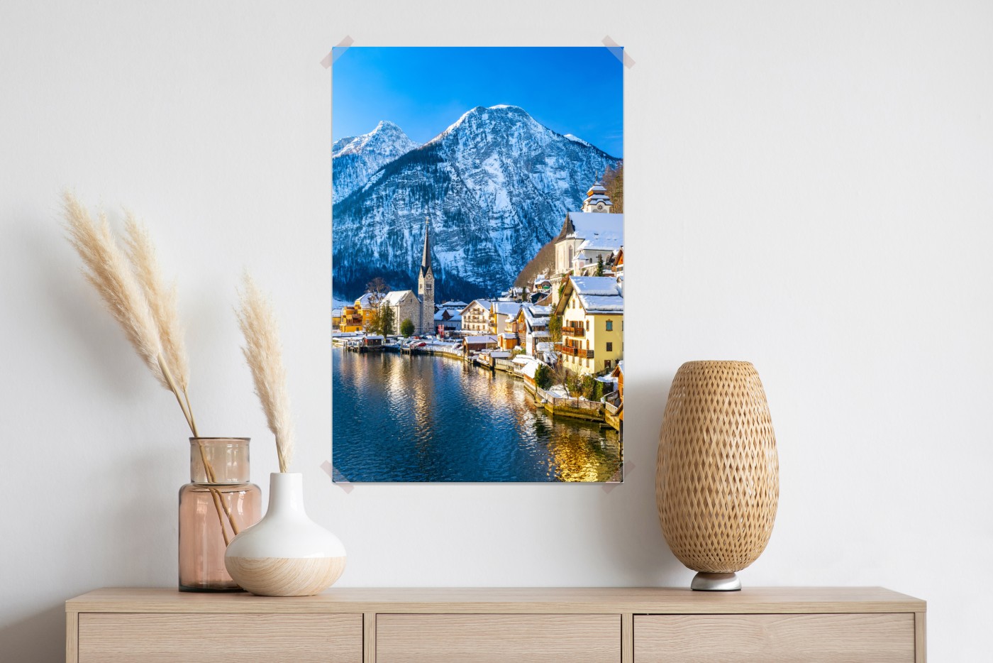 Plakat Zimowy spokój w Hallstatt — alpejska wioska nad jeziorem