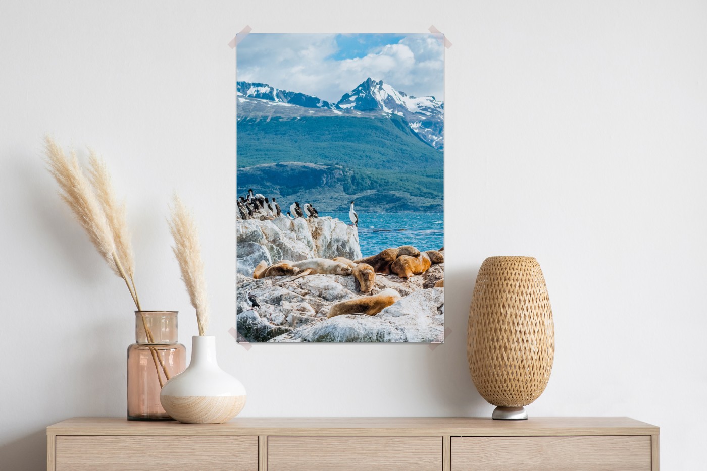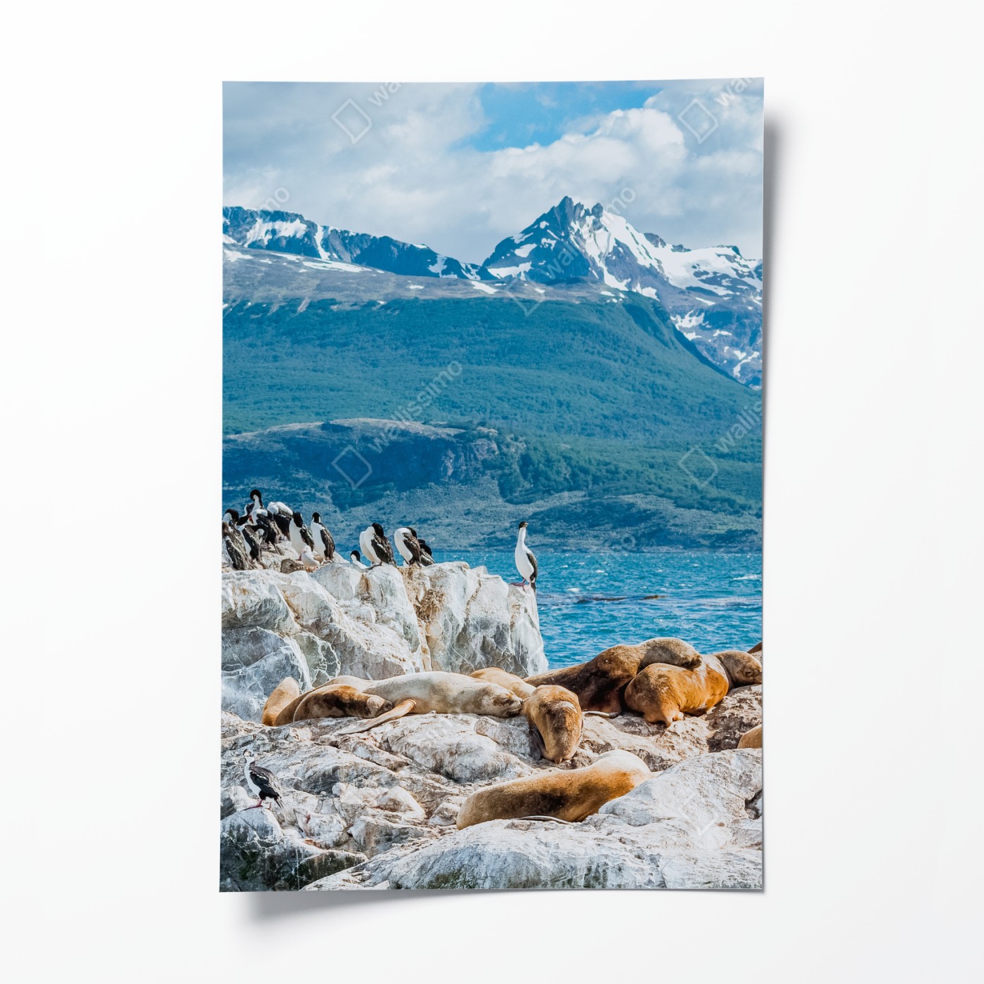Plakat Lwy morskie i ptaki na skalistym wybrzeżu