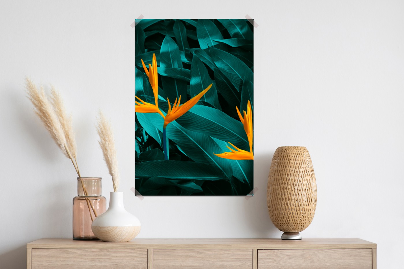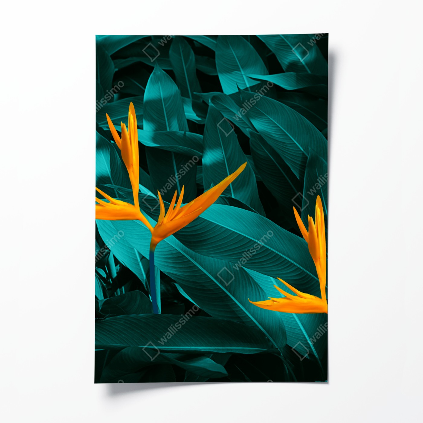 Plakat tropikalna strelicja na turkusowych liściach – Wallissimo®