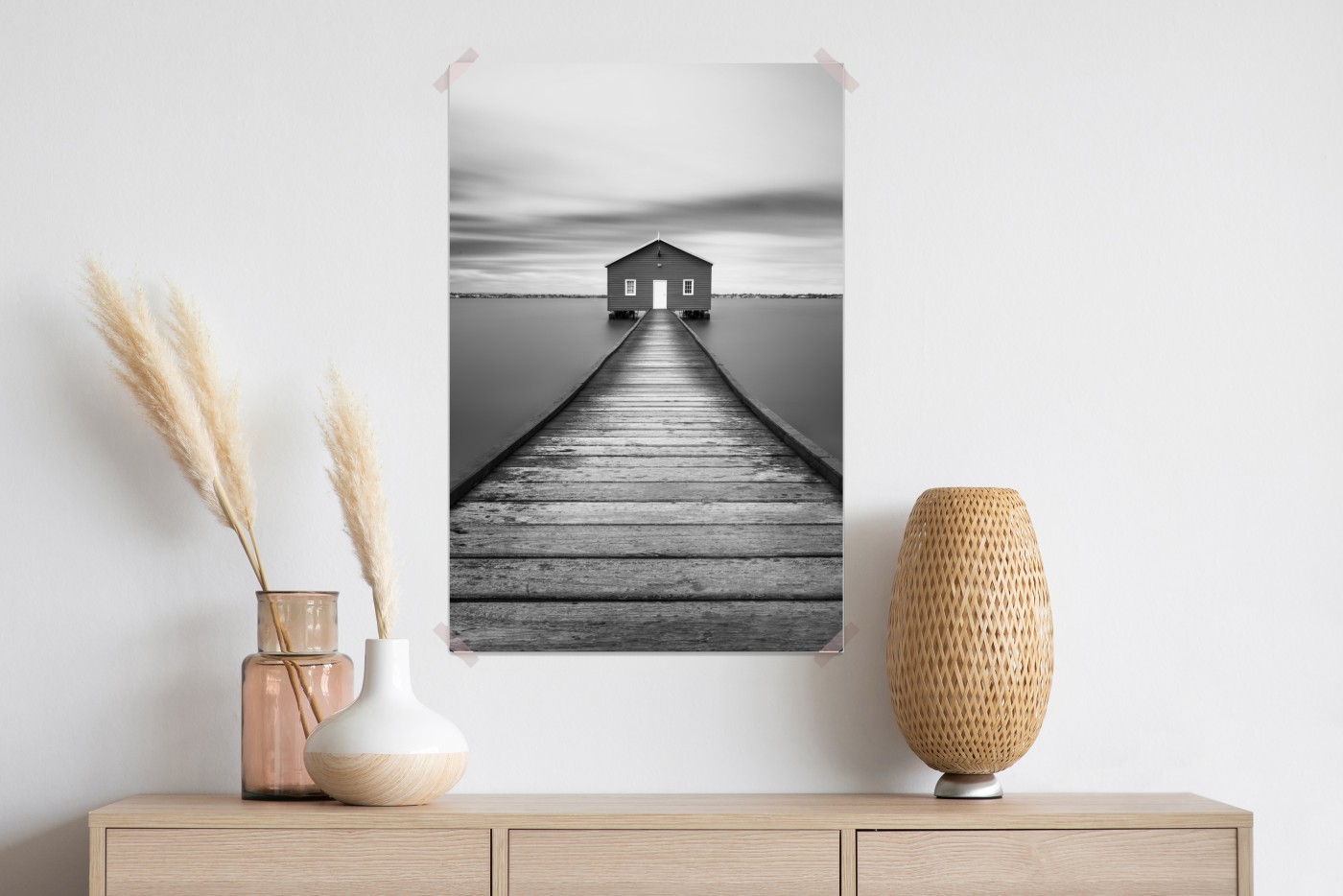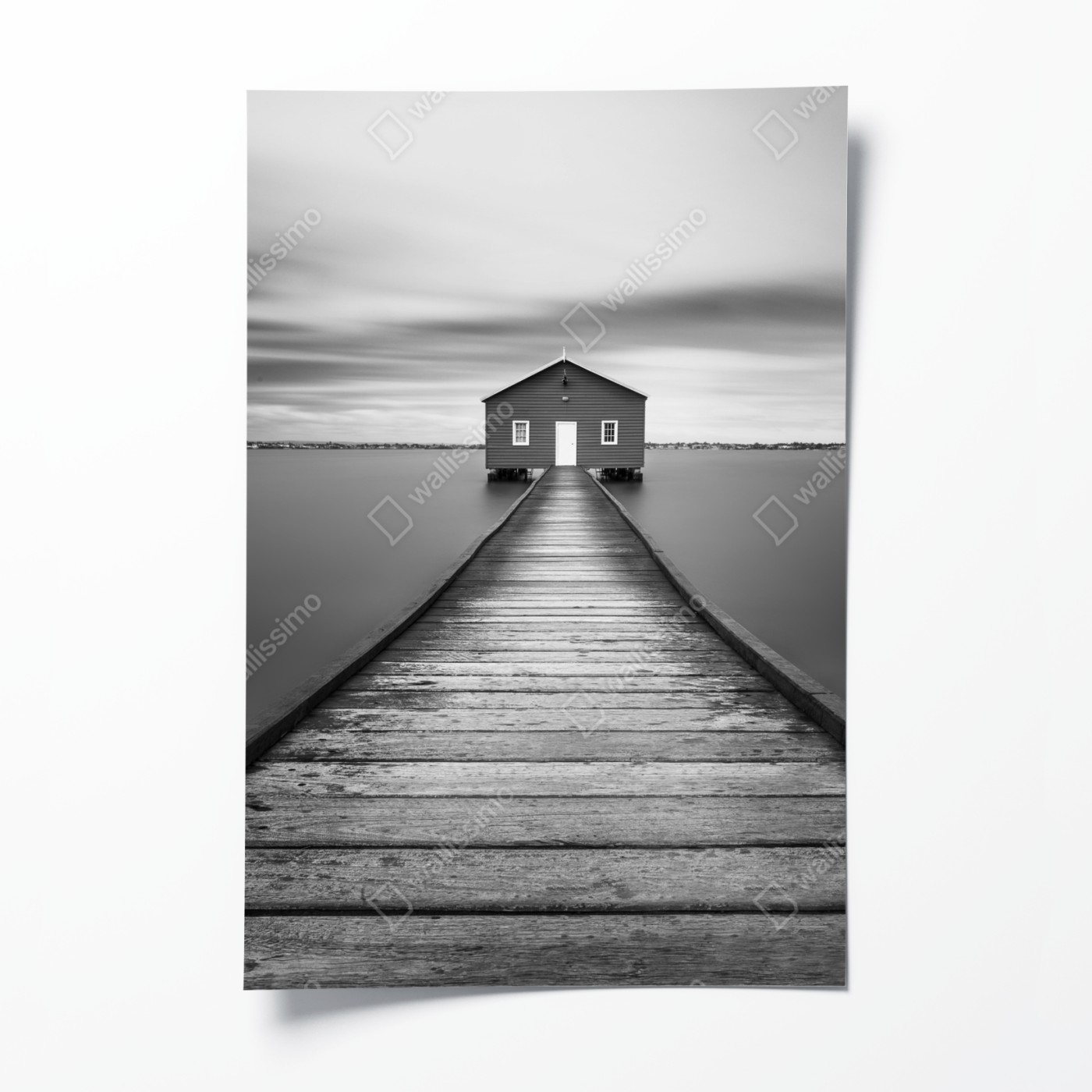 Plakat Samotny domek na pomoście nad spokojną wodą