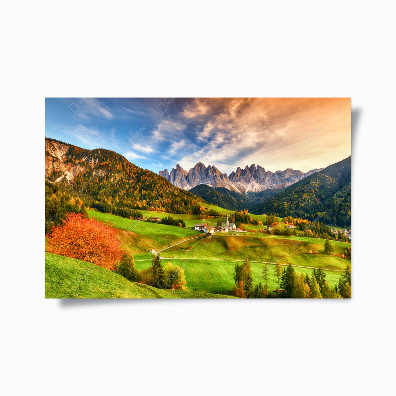 Plakat Jesienny zachód słońca nad Santa Maddalena, Dolomity