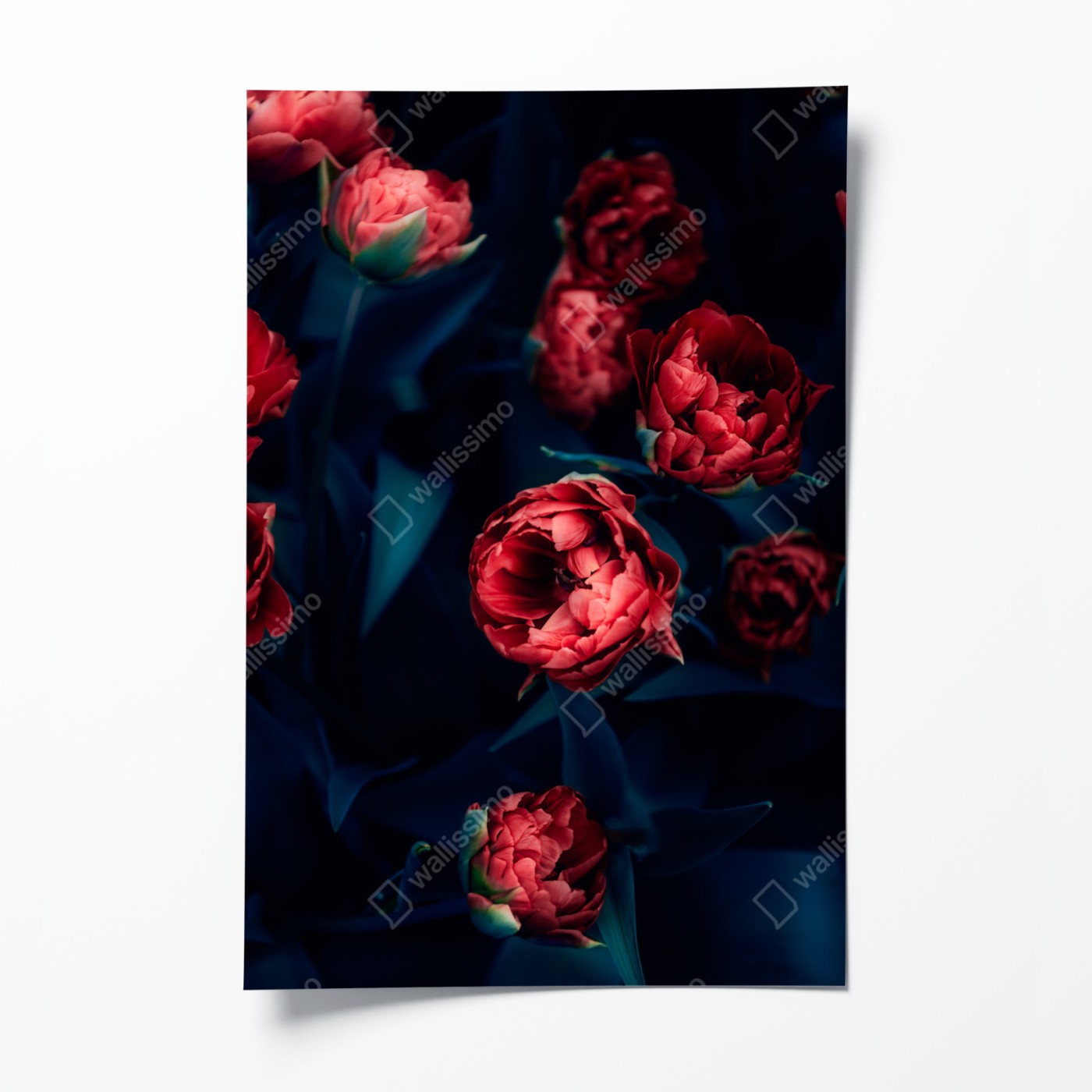 Dodaj dramatycznej elegancji do wnętrza dzięki głębokim czerwonym kwiatom na ciemnym tle; idealne do stworzenia przytulnej, wyrafinowanej atmosfery.WięcejMniej