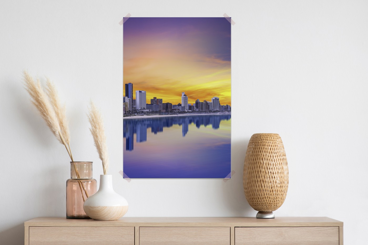 Odkryj spokojny urok wybrzeża Durban podczas zmierzchu uchwycony w żywych kolorach i perfekcyjnych odbiciach, idealny do ozdobienia wnętrza.WięcejMniej