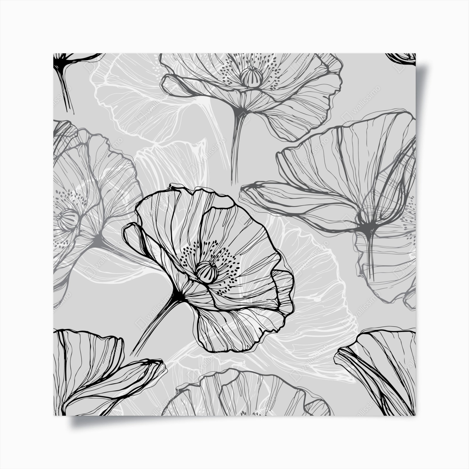 - dekoracja ścienna, botaniczny, wzór bezszwowy, tapeta, kwiatowy, monochromatyczny, rysunek liniowy, kwiat, mak, odcienie szarości