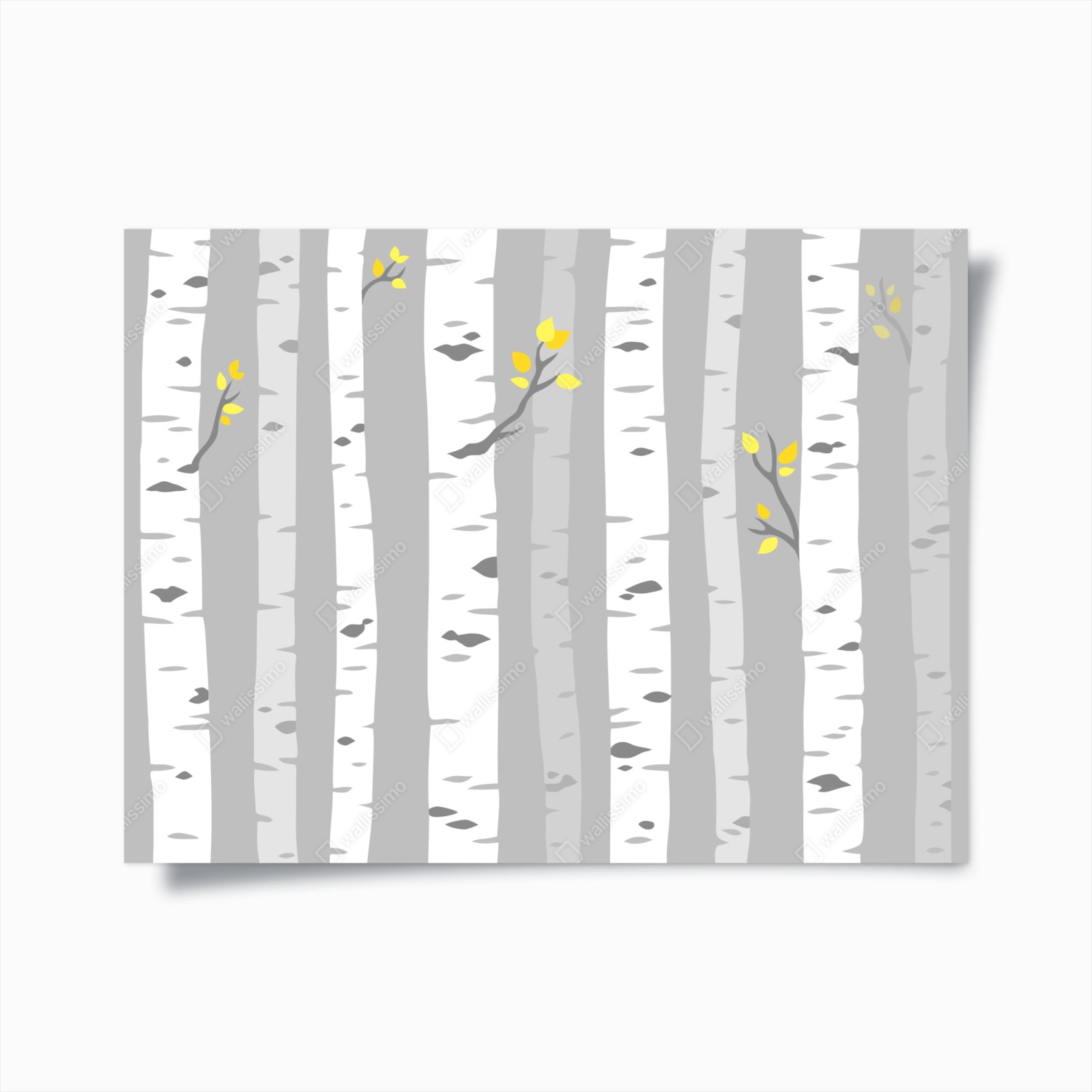 - plakat, wzór, drzewa, las, skandynawski, dekoracja, szary, żółty, minimalizm, brzozy