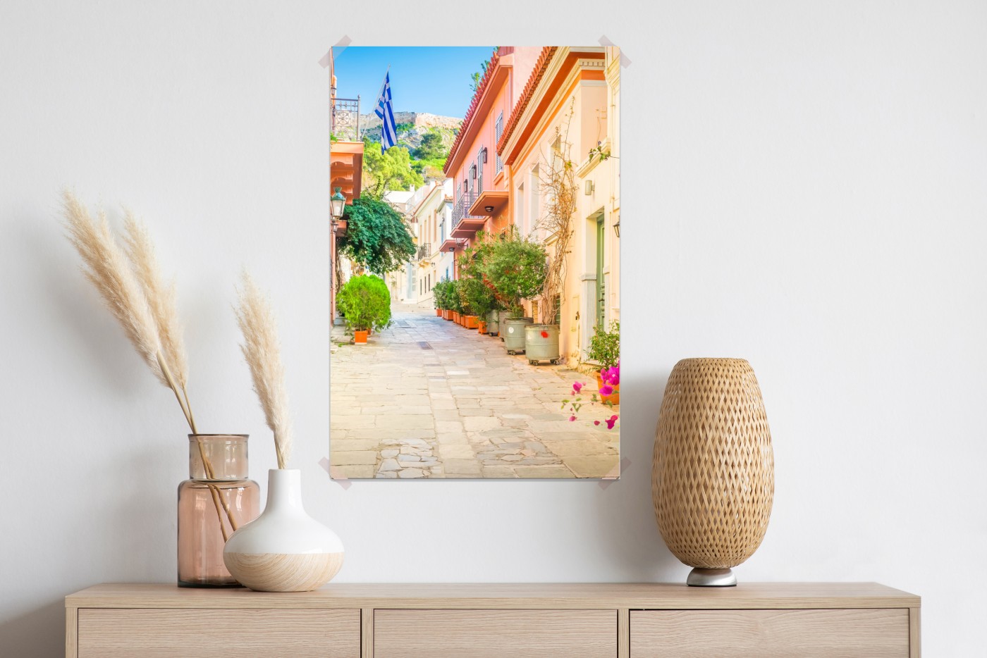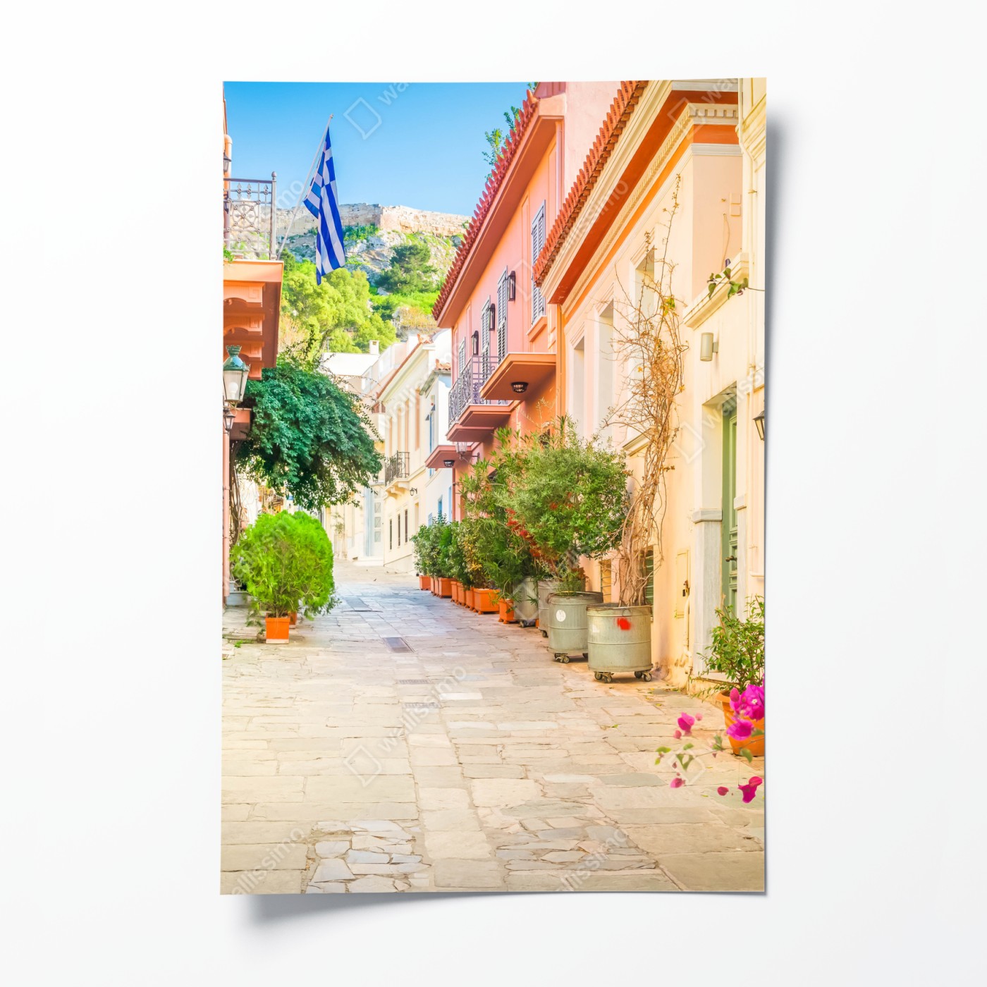 Plakat Słoneczna grecka uliczka z bougainvilleą