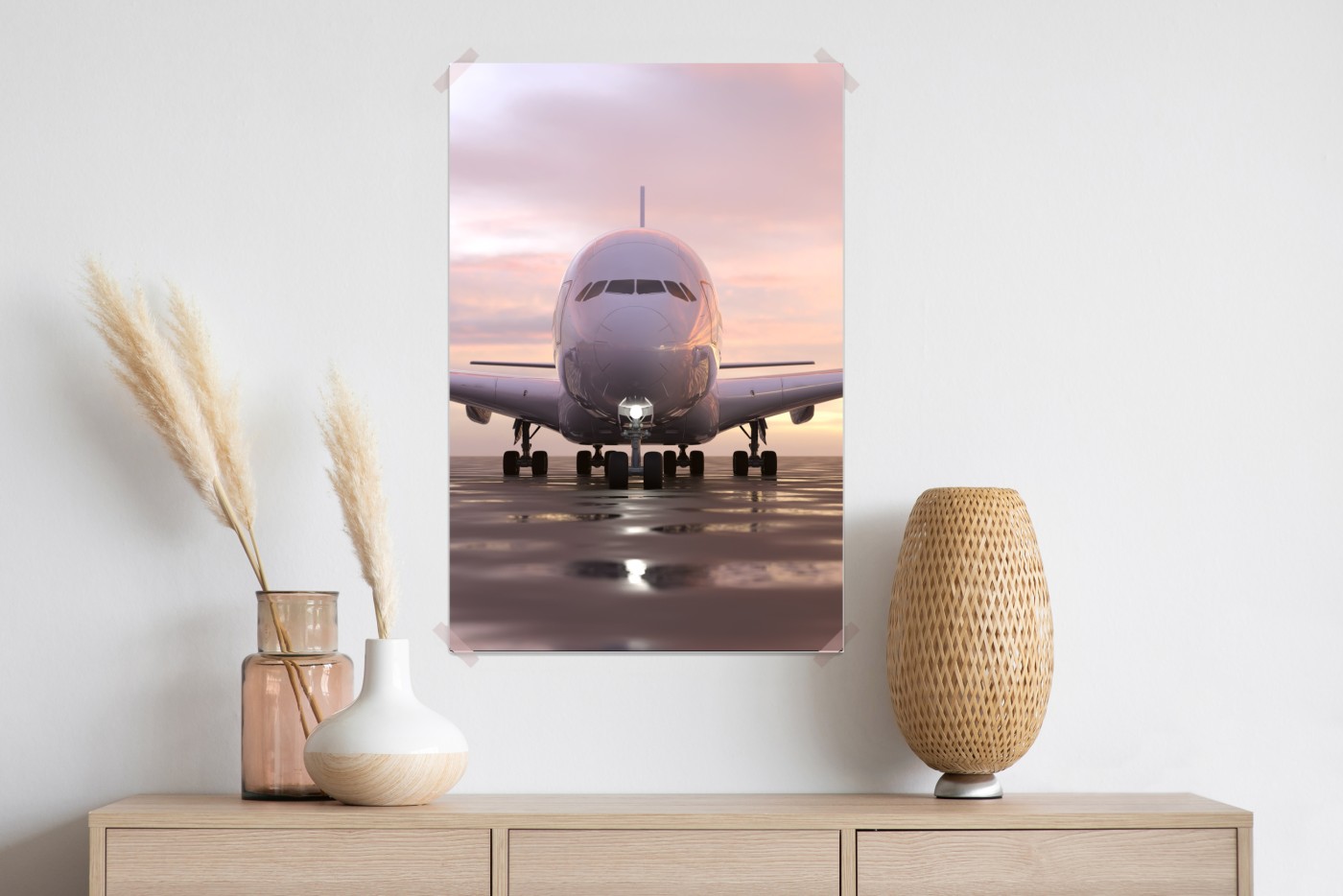 Plakat Odrzutowiec na pasie startowym o zachodzie słońca