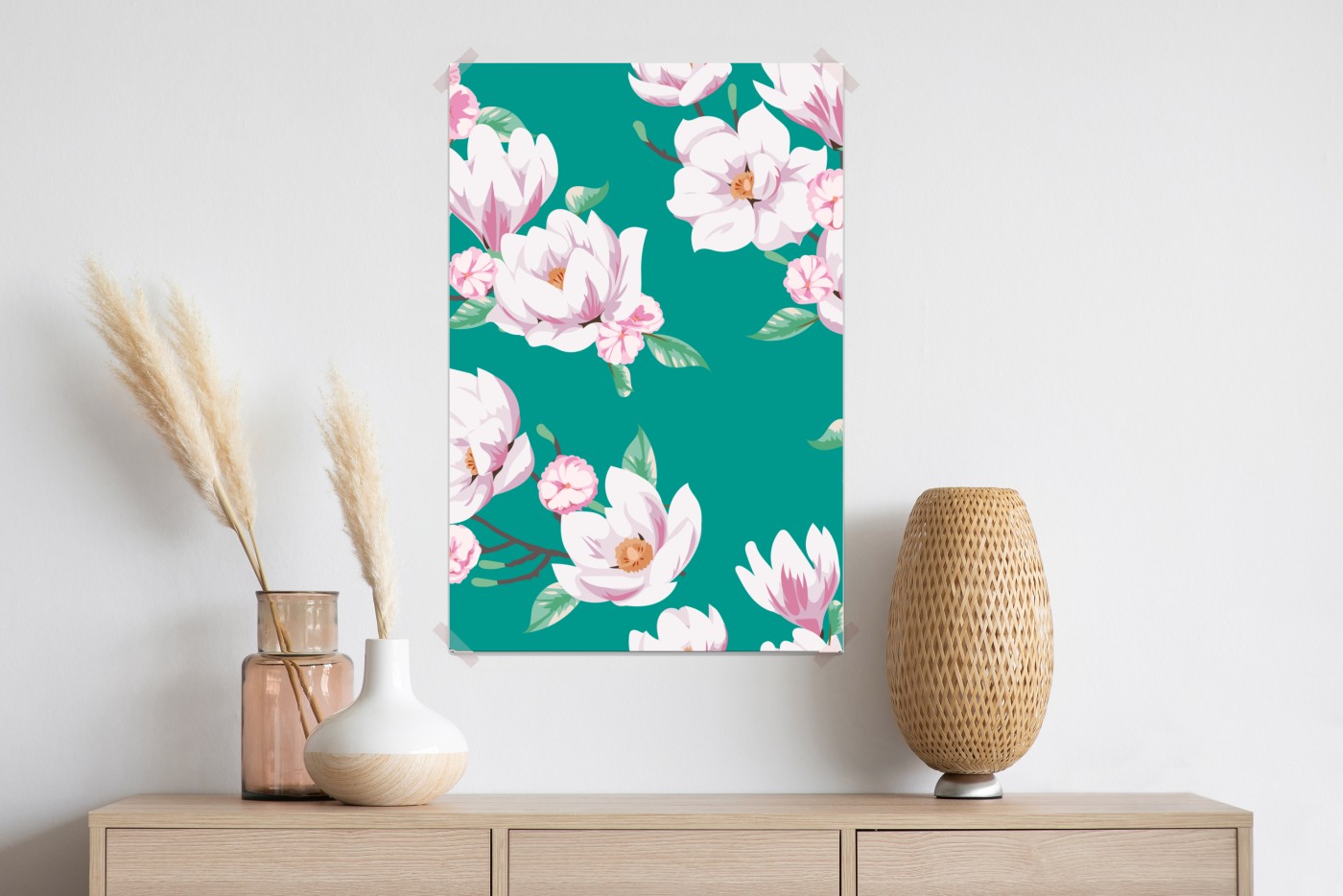 Plakat Pastelowy wzór magnolii na turkusowym tle