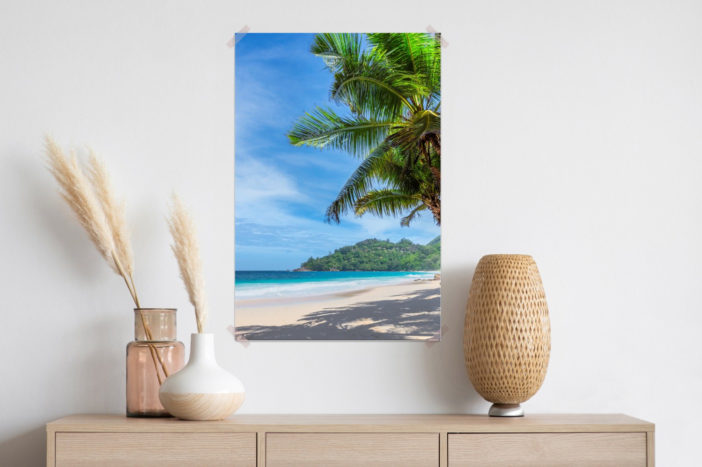 Plakat Tropikalna plaża z palmami i żaglówką