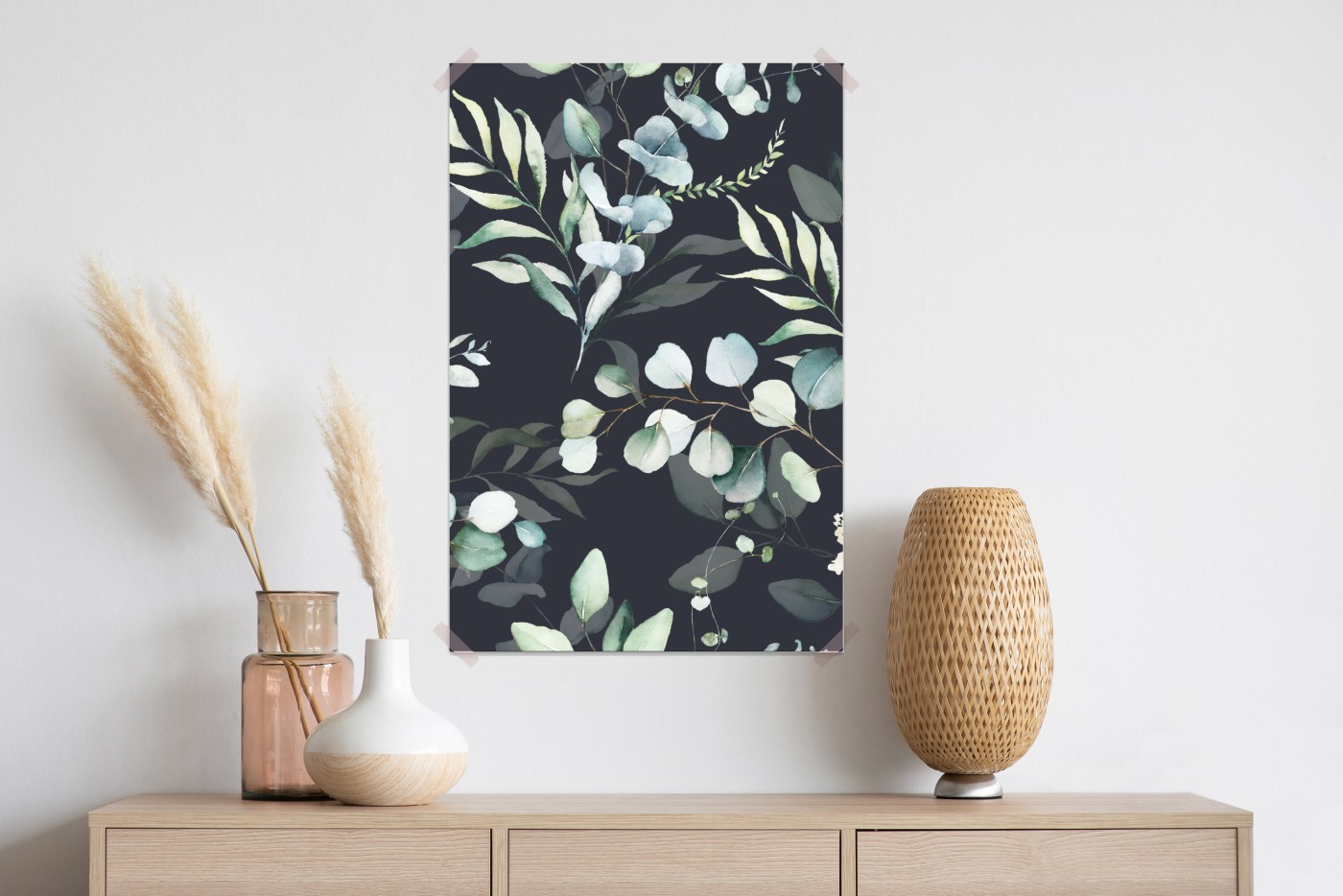 Wprowadź spokój i naturę do wnętrza dzięki akwarelowemu wzorowi eukaliptusa na głębokim grafitowym tle, idealny do sypialni w stylu skandynawskim.WięcejMniej