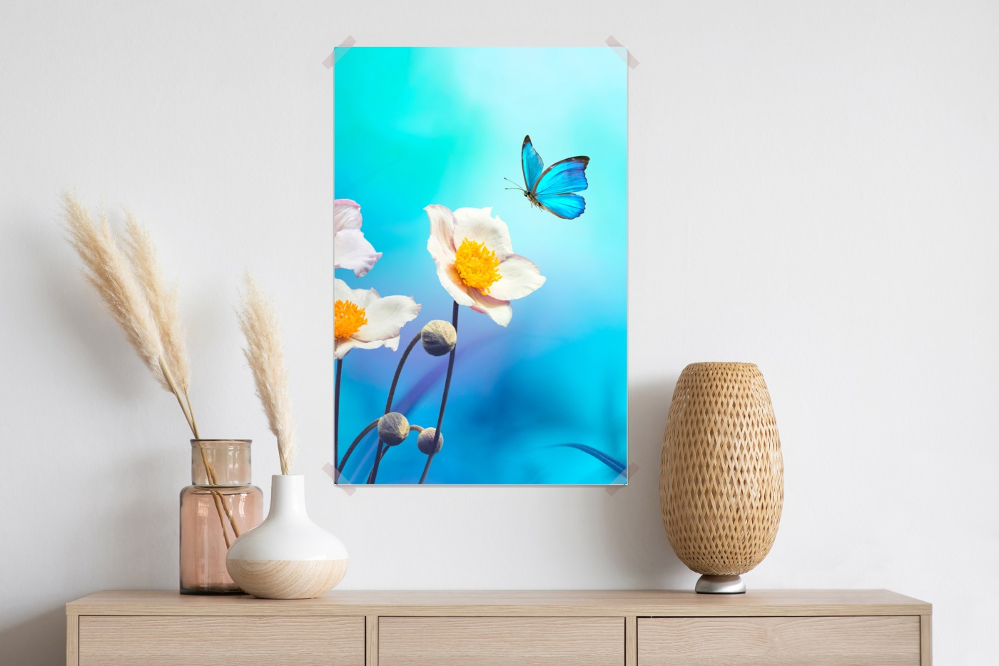 Plakat Delikatne różowe anemony i niebieski motyl