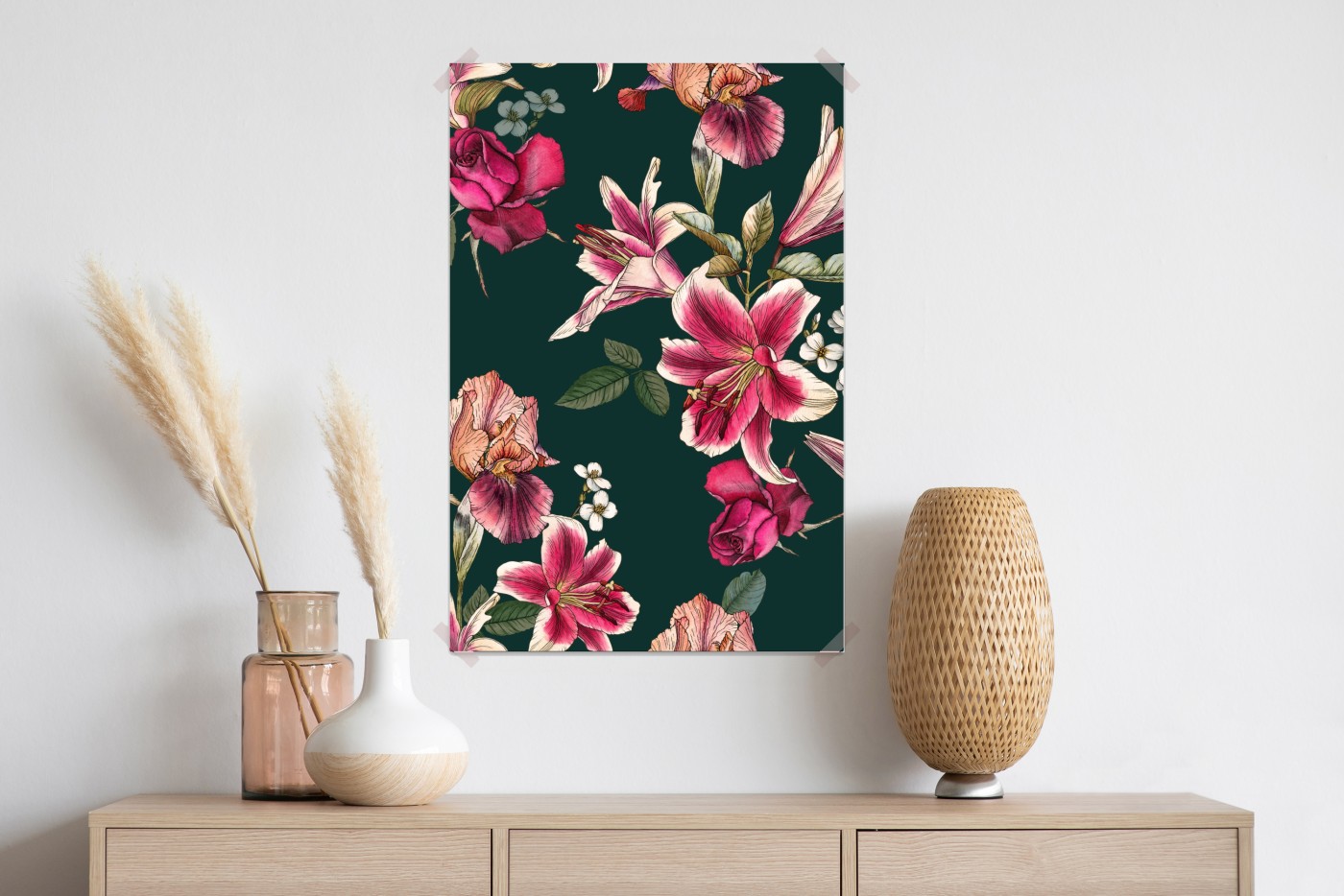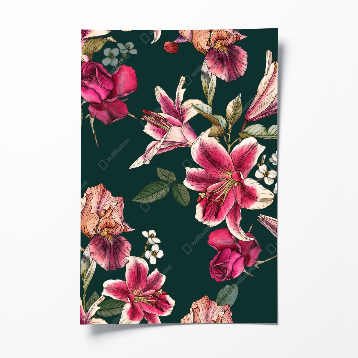 Plakat Vintage botaniczny wzór kwiatowy na głębokiej zieleni