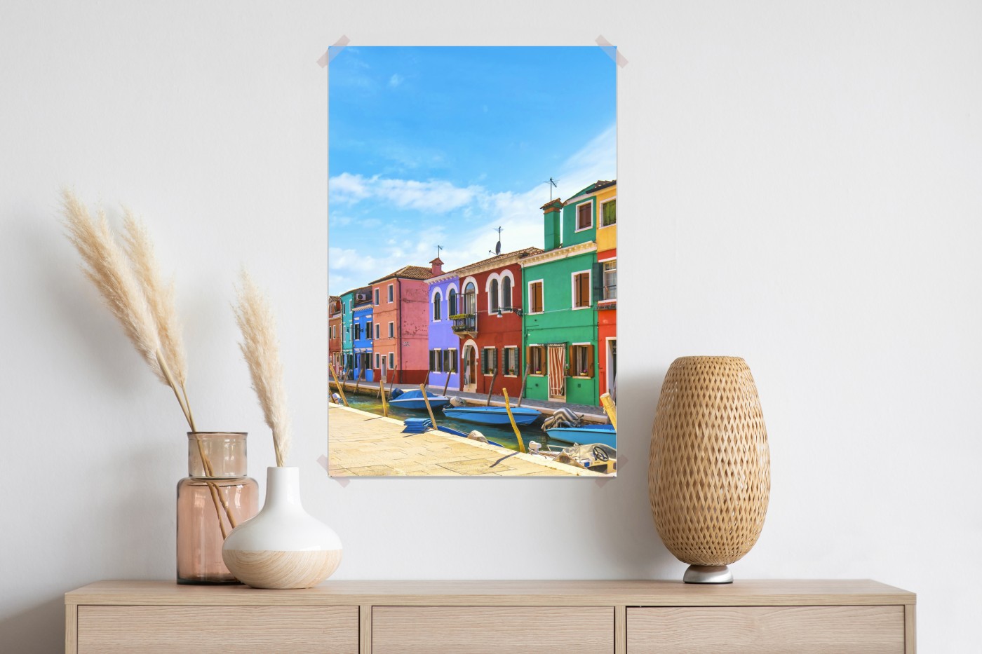 Dodaj wnętrzu żywy włoski klimat dzięki temu zdjęciu kolorowych domów w Burano nad malowniczym kanałem.WięcejMniej