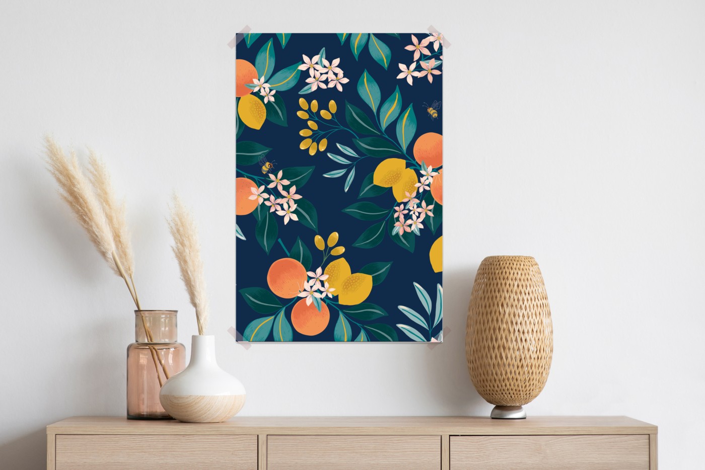 Plakat Botaniczny wzór z kwiatami cytrusów na granatowym tle