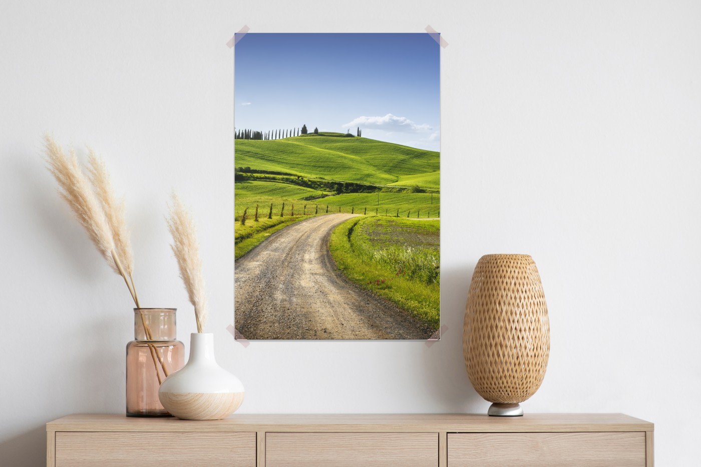 Plakat Wiejska droga w Toskanii przez zielone wzgórza