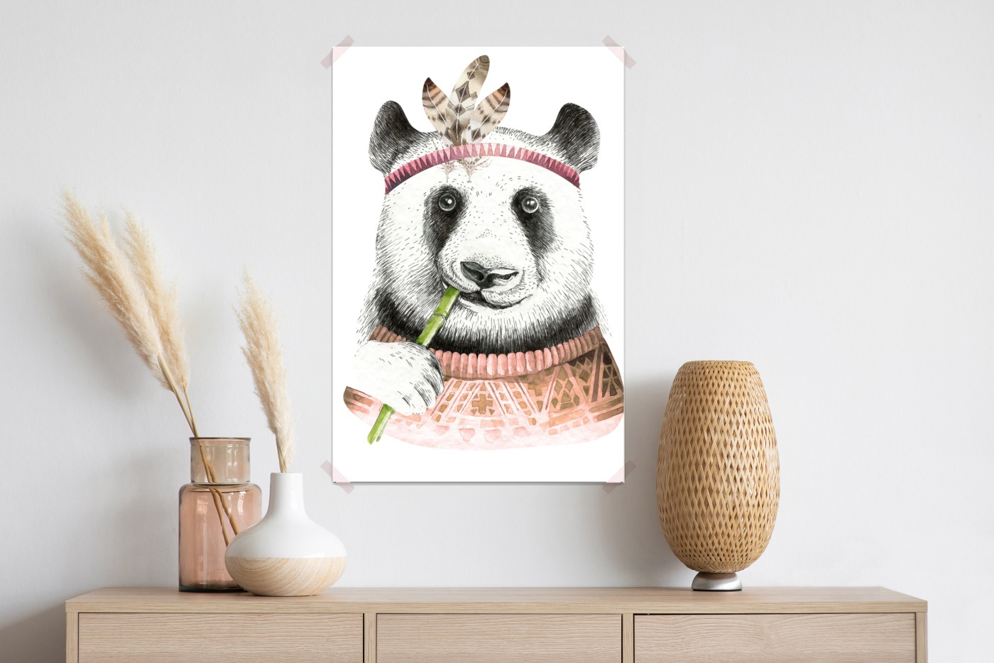 Plakat Boho akwarelowa panda z piórami