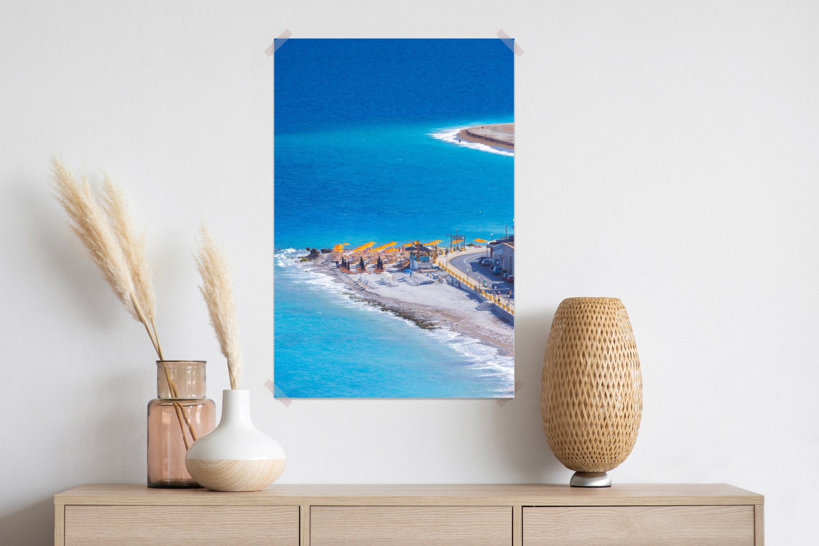 Wprowadź intensywne błękity Rodos do wnętrza dzięki temu spokojnemu obrazowi wybrzeża z turkusową wodą i słonecznymi parasolami.