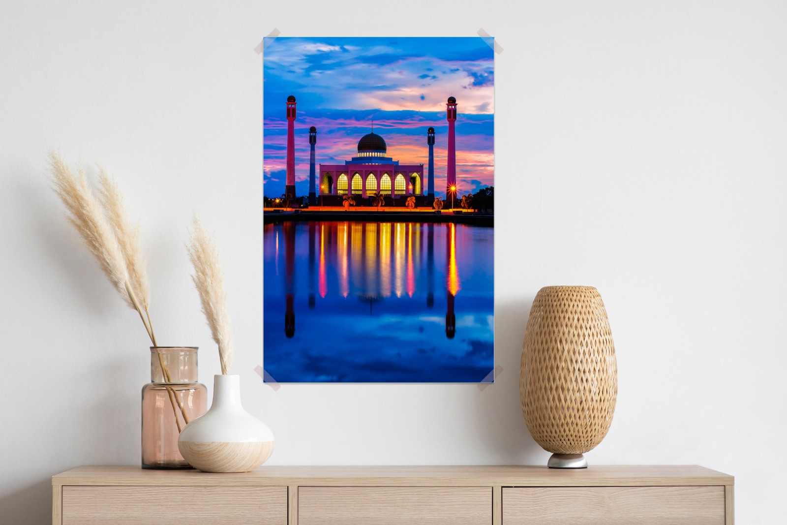 Poczuj spokojny wieczór i żywe odbicia wody na widoku meczetu w Songkhla, idealne do ożywienia wnętrza.