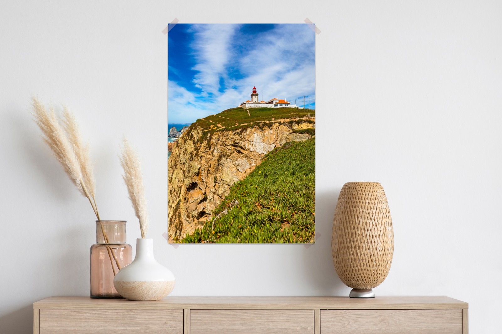 Odkryj dramatyczne piękno wybrzeża Cabo da Roca dzięki tej żywej scenie z latarnią morską, idealnej do ozdobienia ściany.