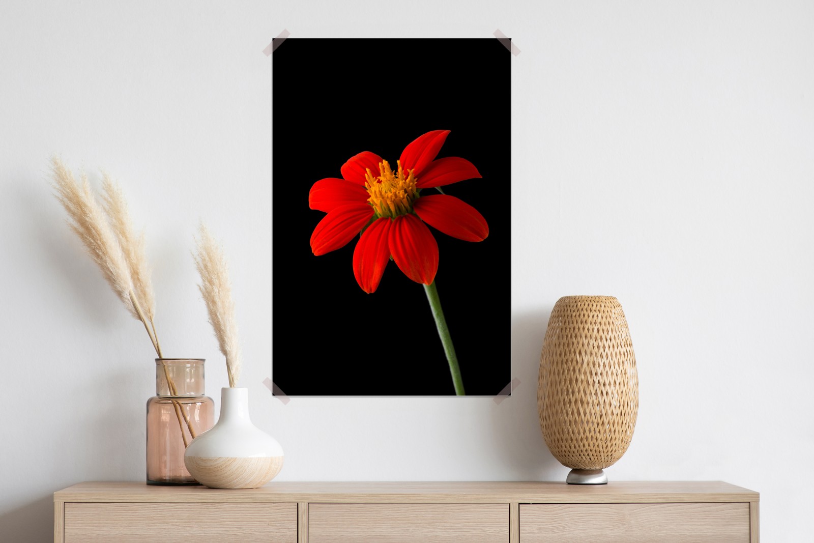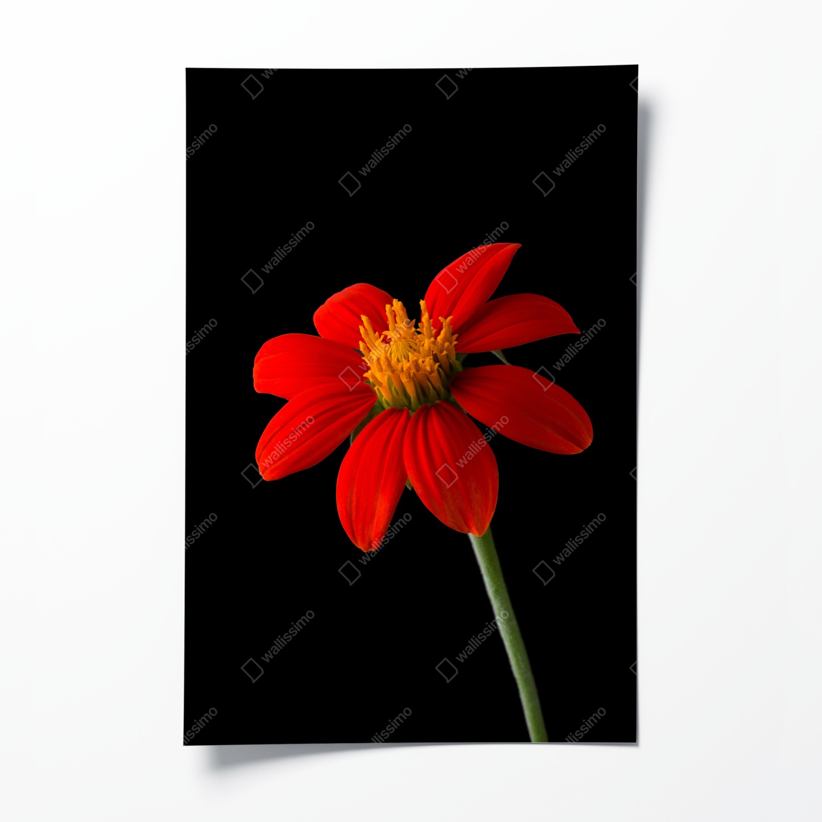 Jaskrawy czerwono-pomarańczowy słonecznik meksykański na głębokim czarnym tle wprowadza wyrazistą botaniczną elegancję do każdego wnętrza.