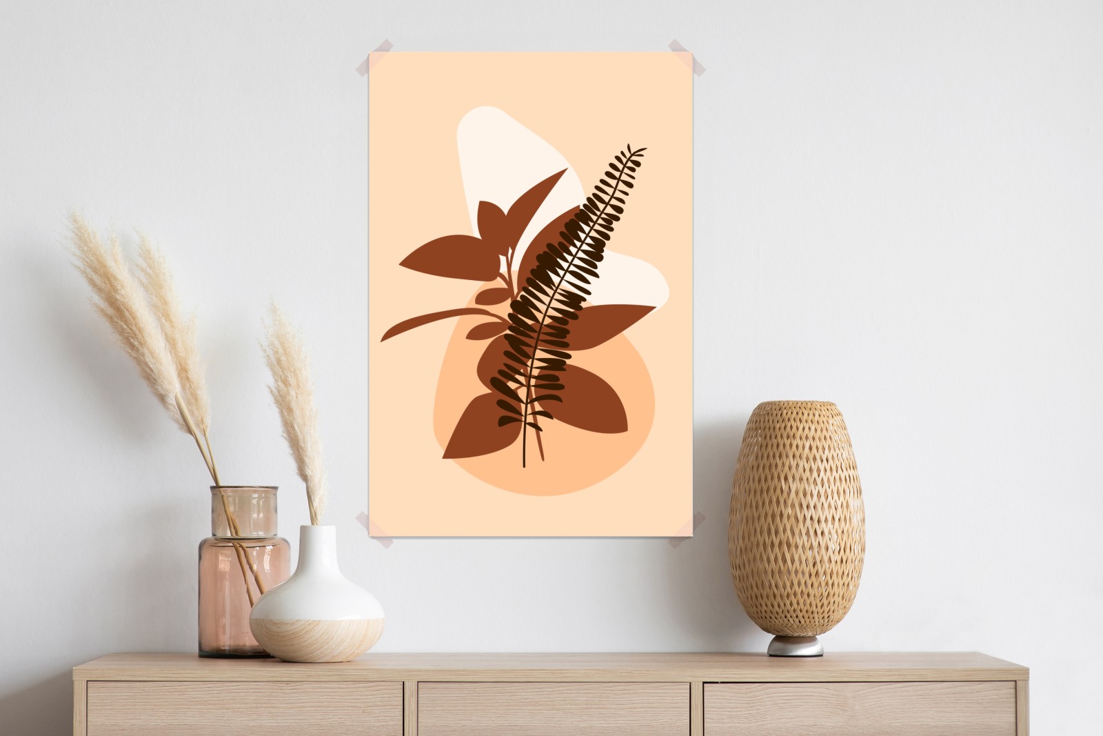 Dodaj ciepła do wnętrza dzięki minimalistycznej abstrakcyjnej grafice liści w ciepłych, ziemistych tonach, idealnej do nowoczesnych i przytulnych przestrzeni.