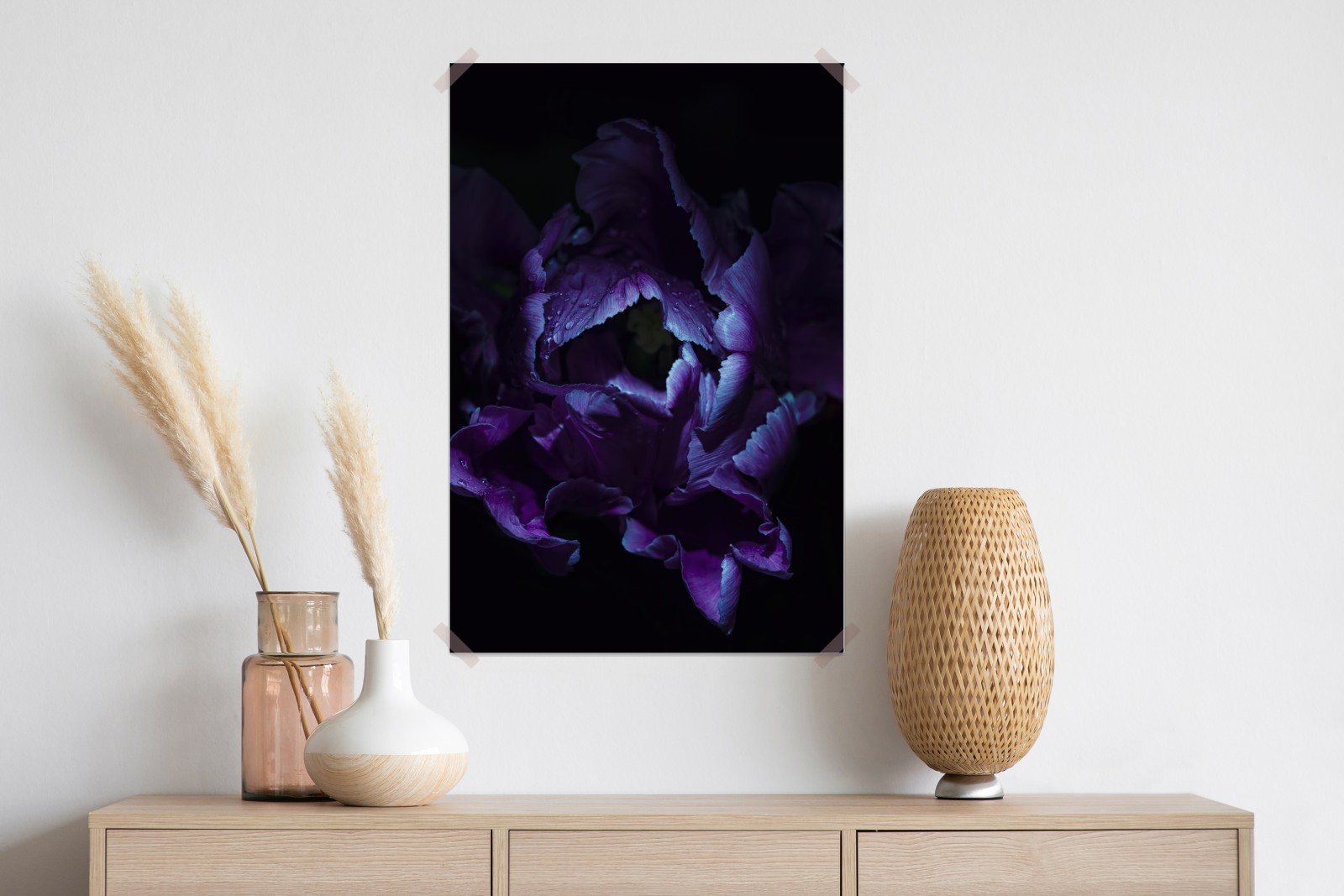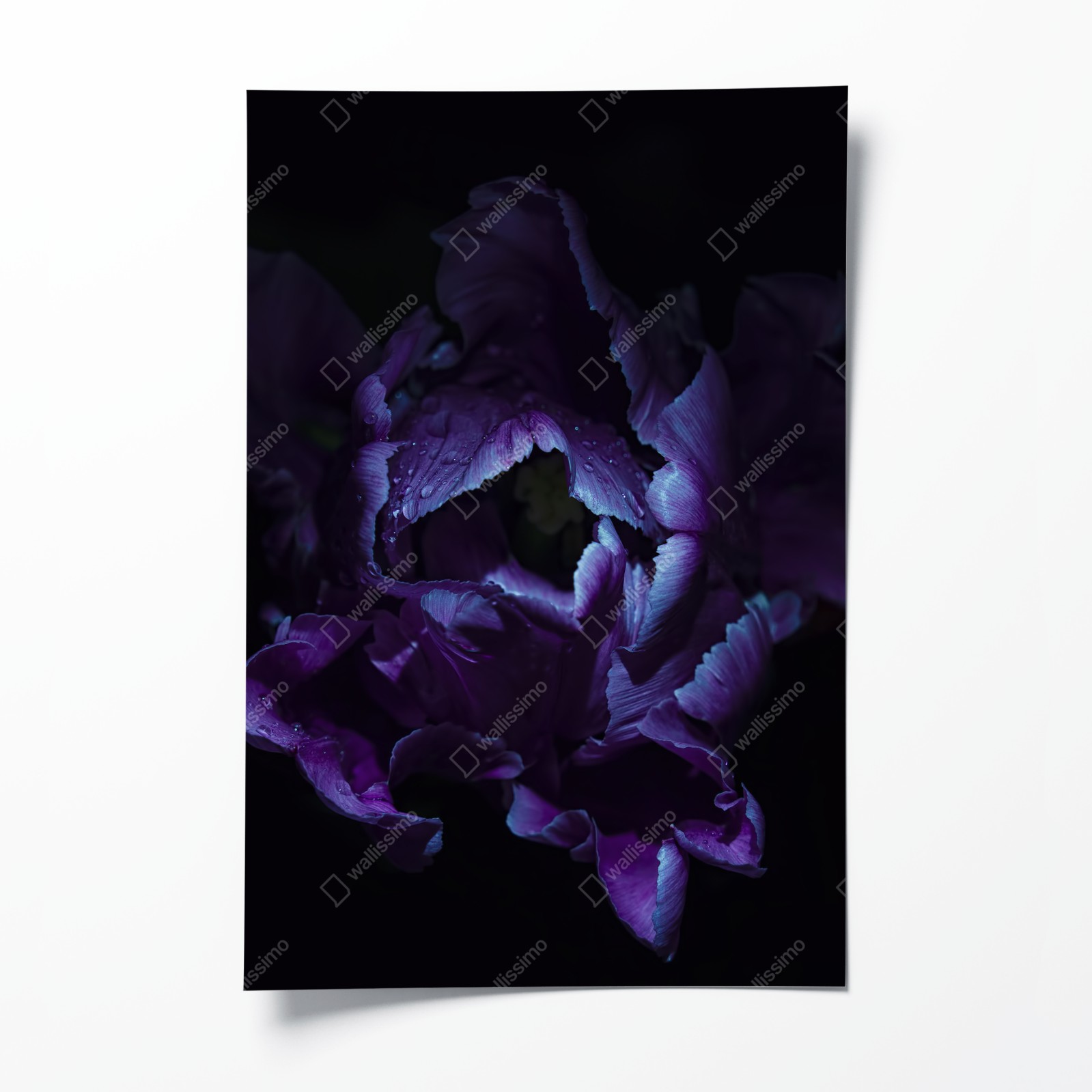 Dodaj dramatycznego kwiatowego uroku do wnętrza dzięki zbliżeniu fioletowego tulipana w ultrafiolecie, ukazującemu kropelki rosy i tekstury na ciemnym tle.