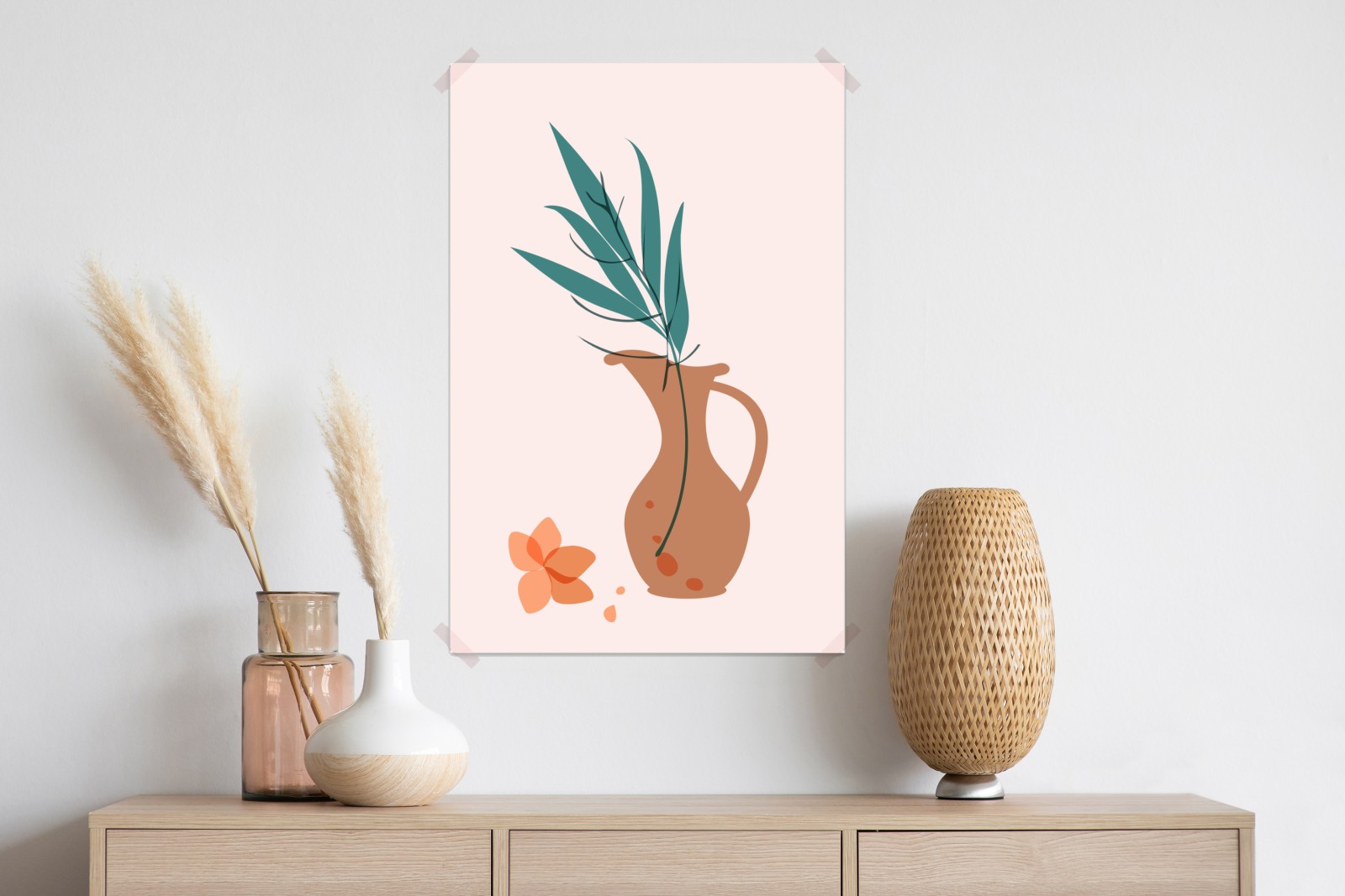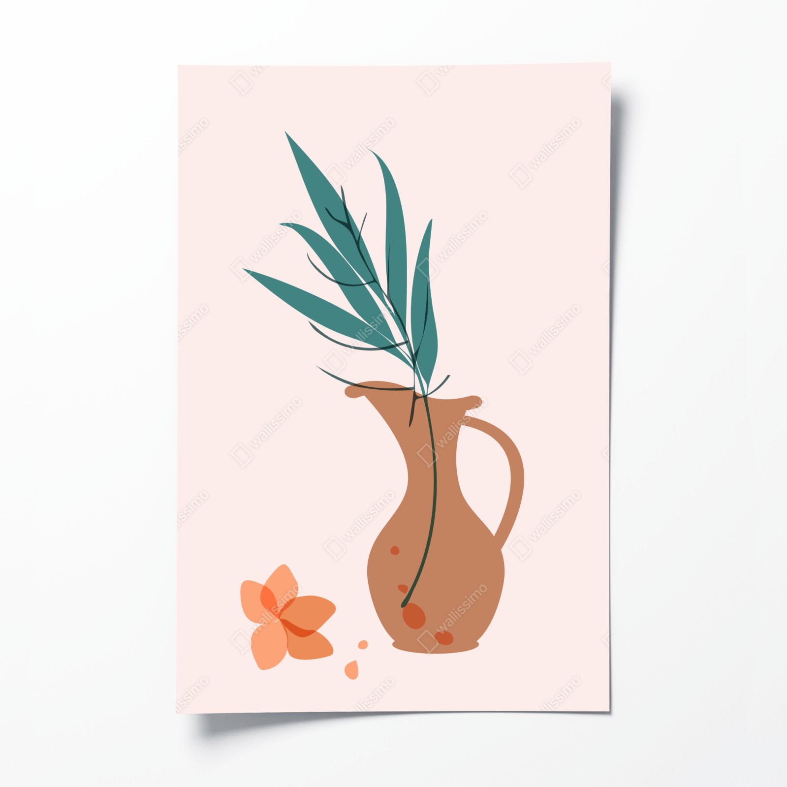 Dodaj uspokajający botaniczny akcent do wnętrza dzięki tej pastelowej ilustracji terakotowej wazy i zielonych liści.