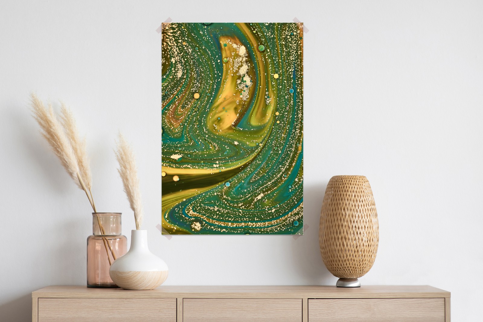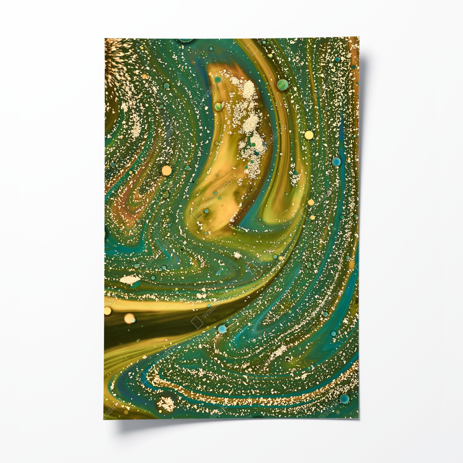 Dodaj energii swojej przestrzeni dzięki zielono-złotej płynnej marmurkowej grafice z migotliwymi detalami.