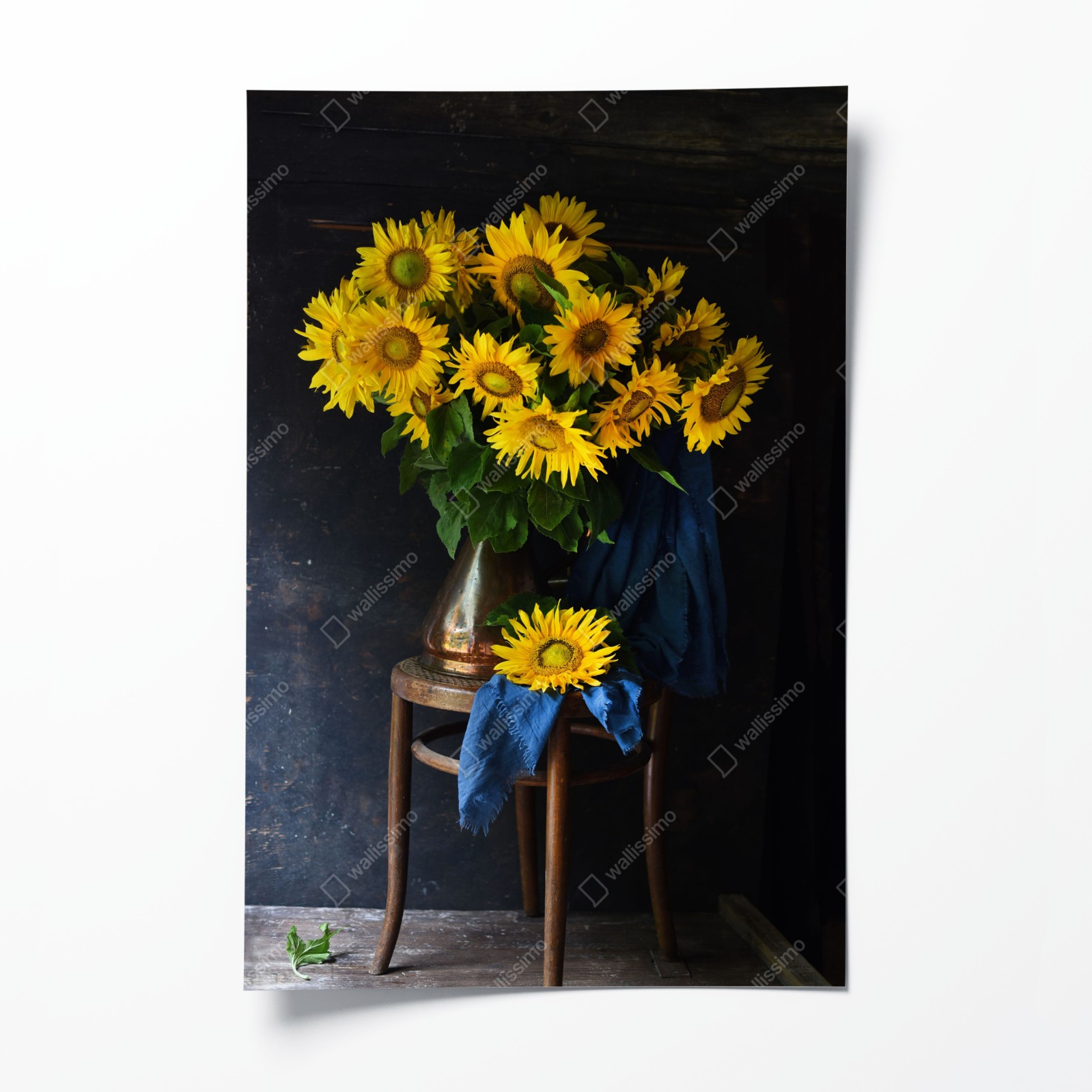 Plakat Wibrujący bukiet słoneczników na vintage stołku
