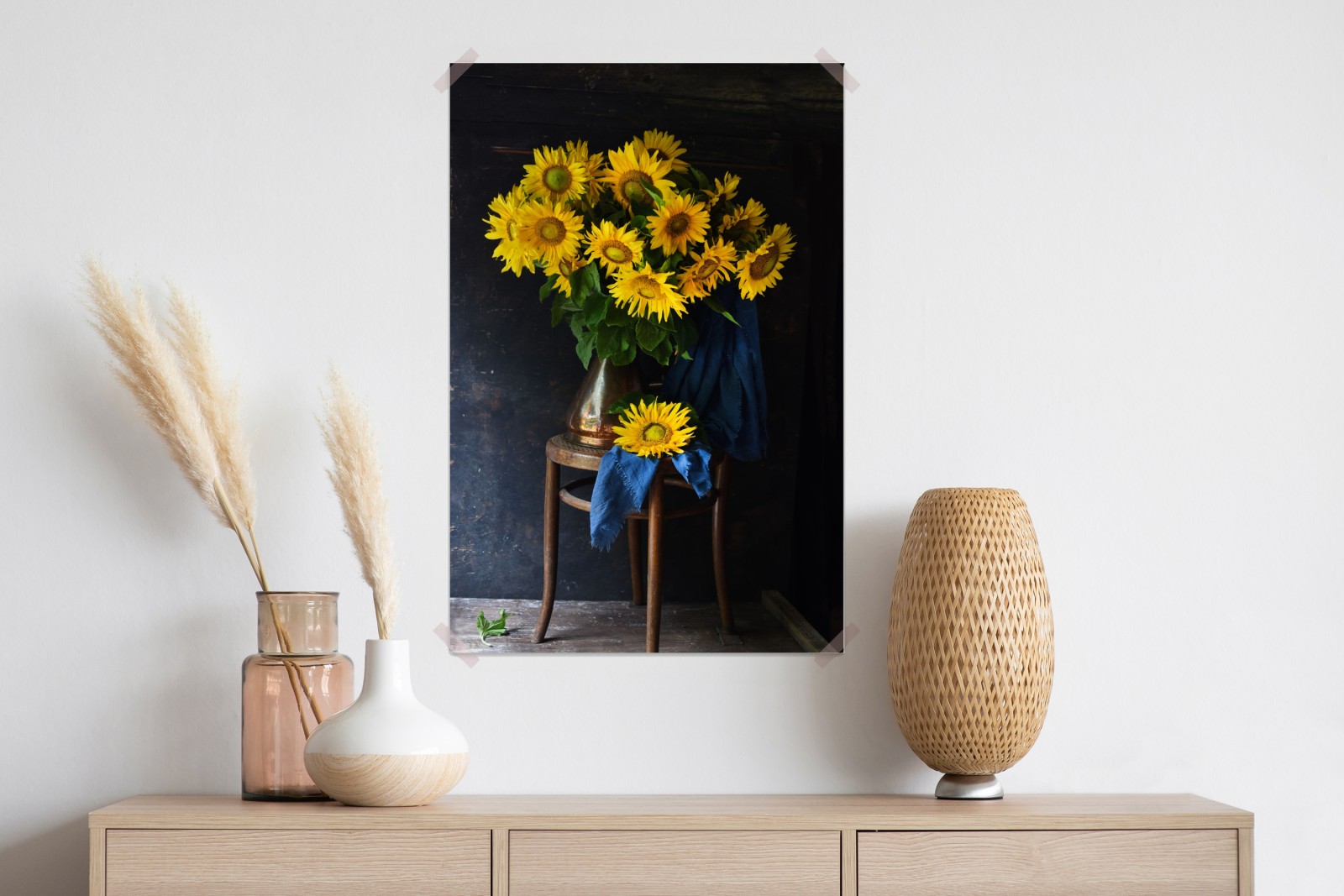 Dodaj ciepły, rustykalny urok do swojego wnętrza dzięki temu wibrującemu martwemu naturze z słonecznikami.