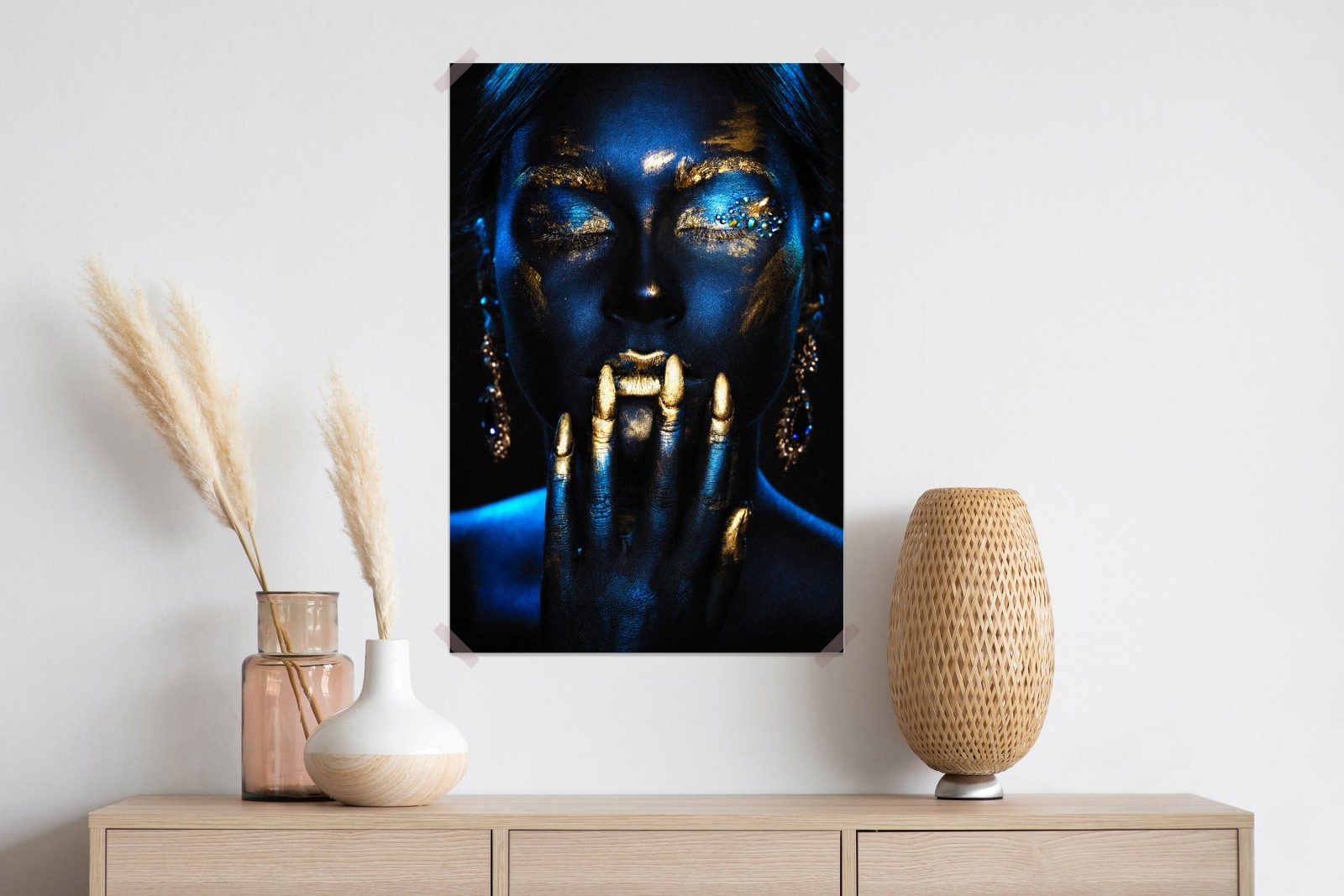 Rozświetl swoje wnętrze wyrazistym portretem łączącym głębokie niebieskie tony i metaliczne złote akcenty dla nowoczesnego efektu.