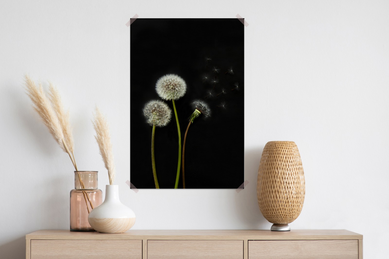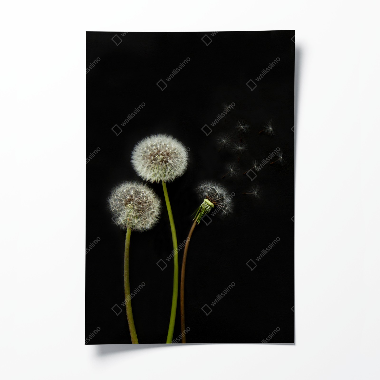 Delikatne nasiona mniszka unoszą się na głębokim czarnym tle, tworząc minimalistyczny i uspokajający motyw botaniki idealny do nowoczesnych wnętrz.