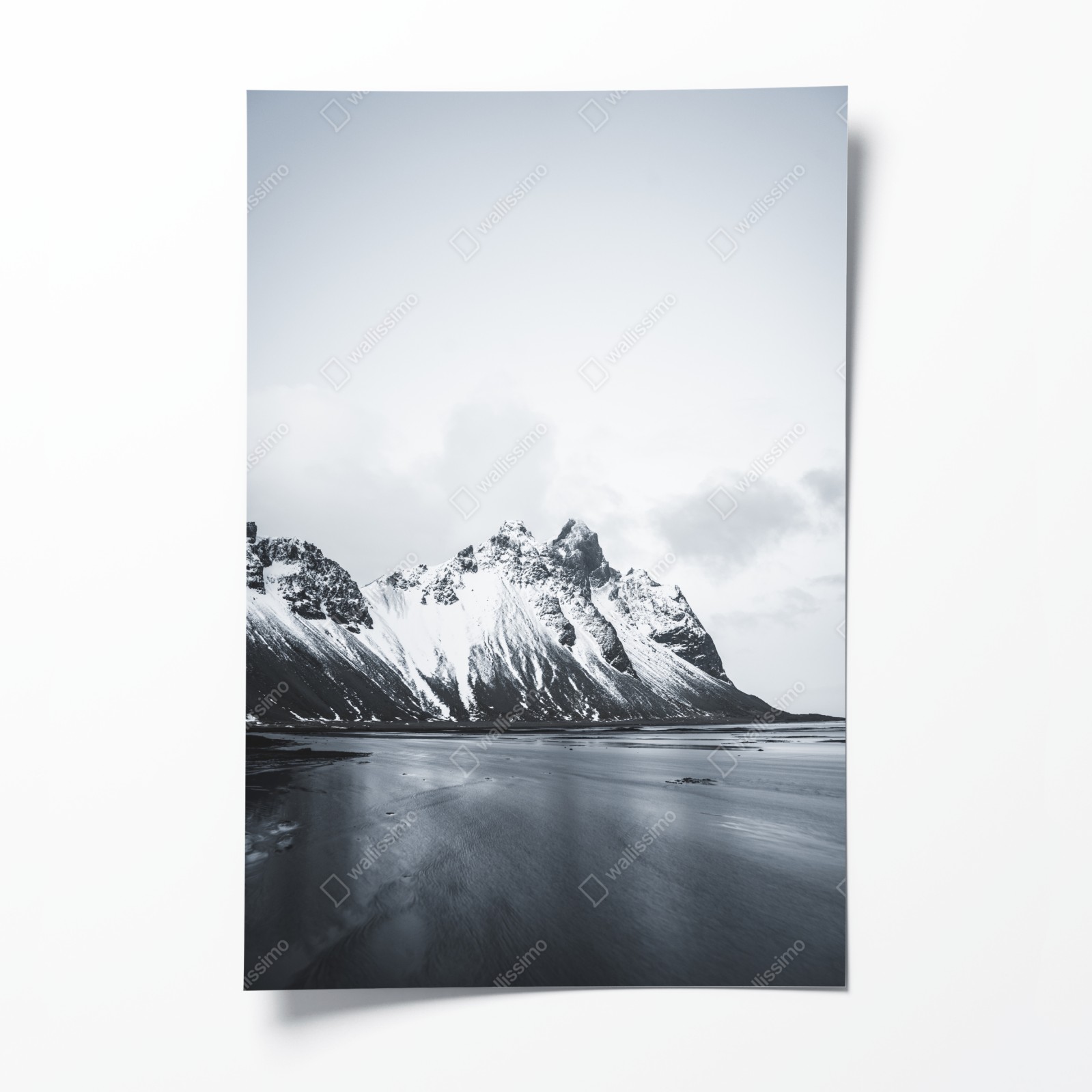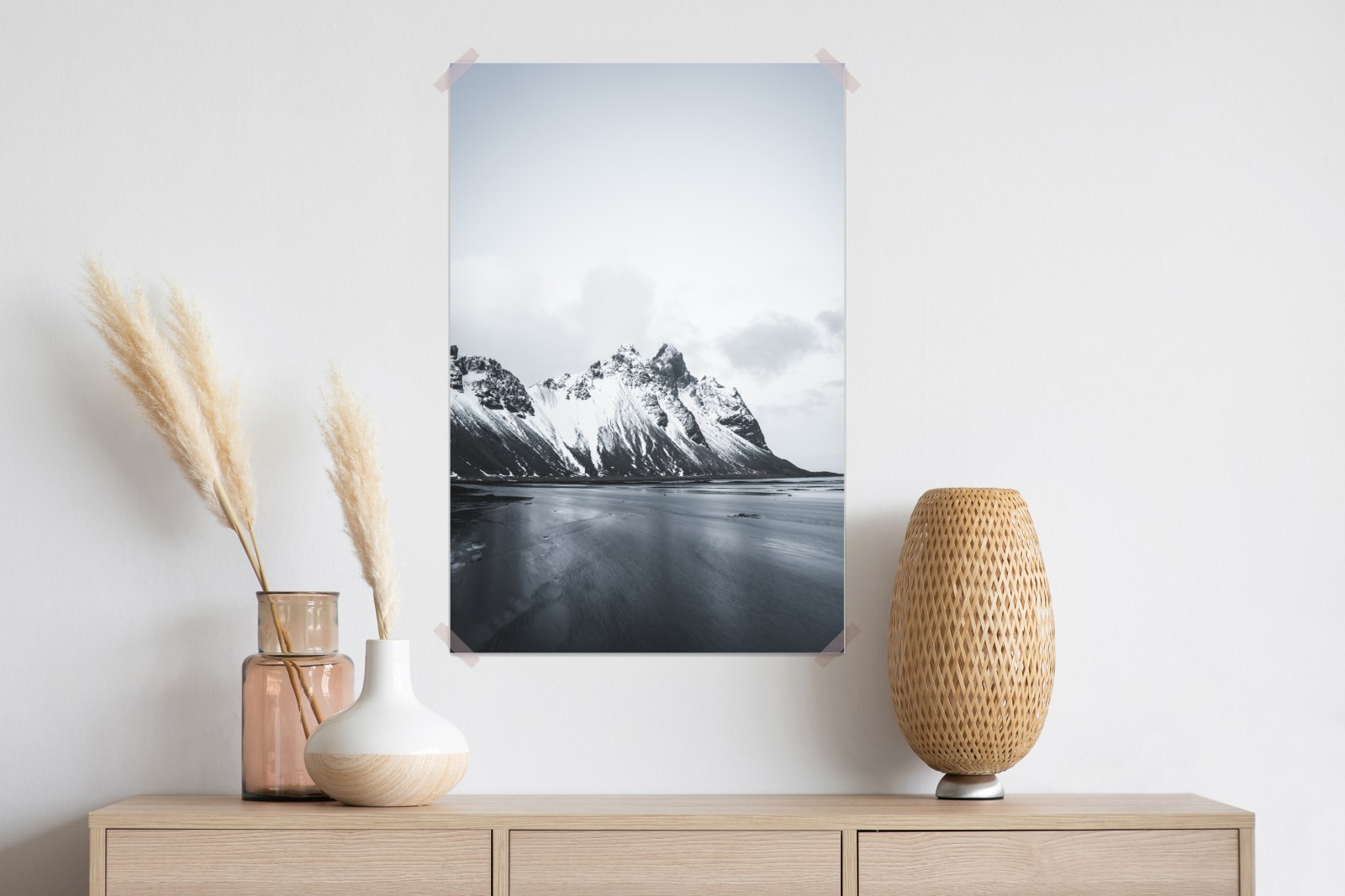 Dodaj do wnętrza spokojny czarno-biały krajobraz górski nad morzem, który wprowadza minimalizm i harmonię.