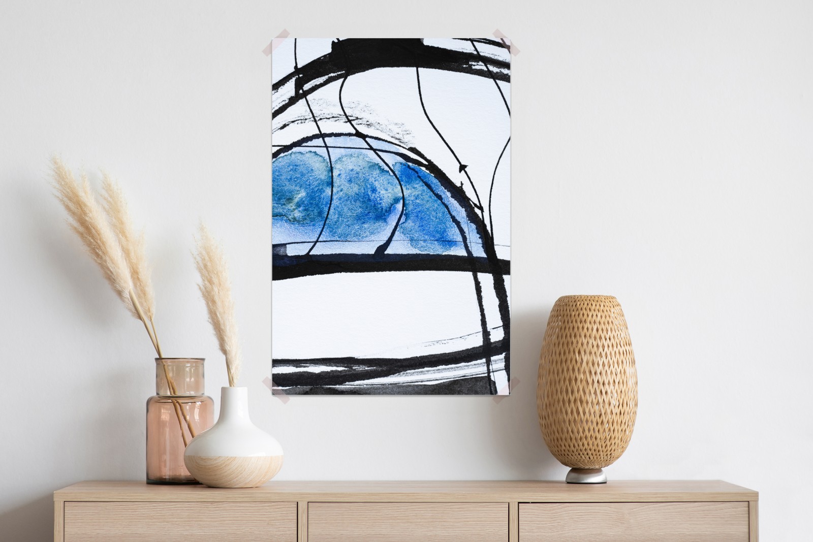 Elegancka abstrakcyjna kompozycja akwareli i tuszu w odcieniach niebieskiego i czerni, idealna do nowoczesnych wnętrz.