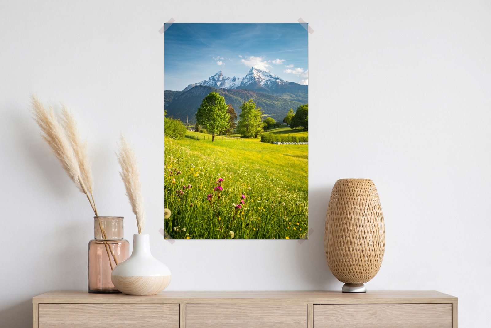 Wprowadź spokój alpejskich łąk i śnieżnych szczytów do swojego wnętrza dzięki temu żywemu wiosennemu krajobrazowi.