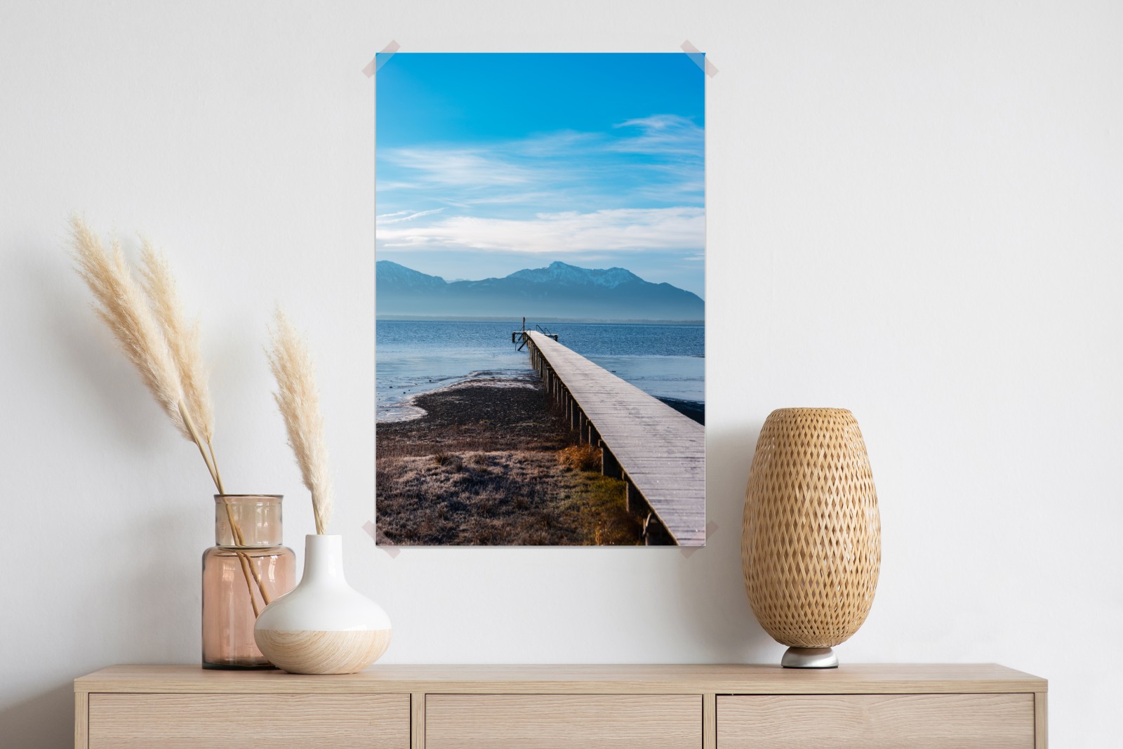 Wprowadź spokój i naturalne piękno do wnętrza dzięki temu spokojnemu pomostowi nad jeziorem z ośnieżonymi górami w tle, idealnemu jako centralny akcent.