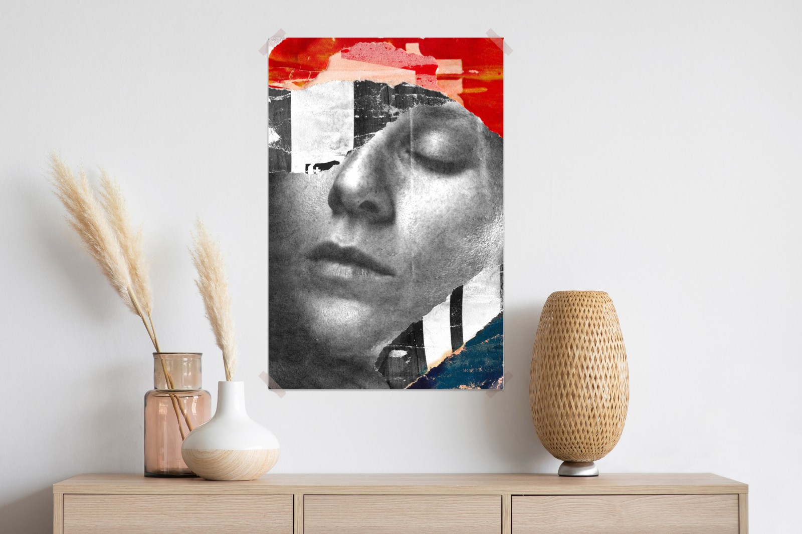 Odkryj uderzający kolaż z porozrywanym portretem łączący monochromatyczny portret z żywymi plamami koloru, tworząc miejski, emocjonalny punkt centralny w twoim wnętrzu.
