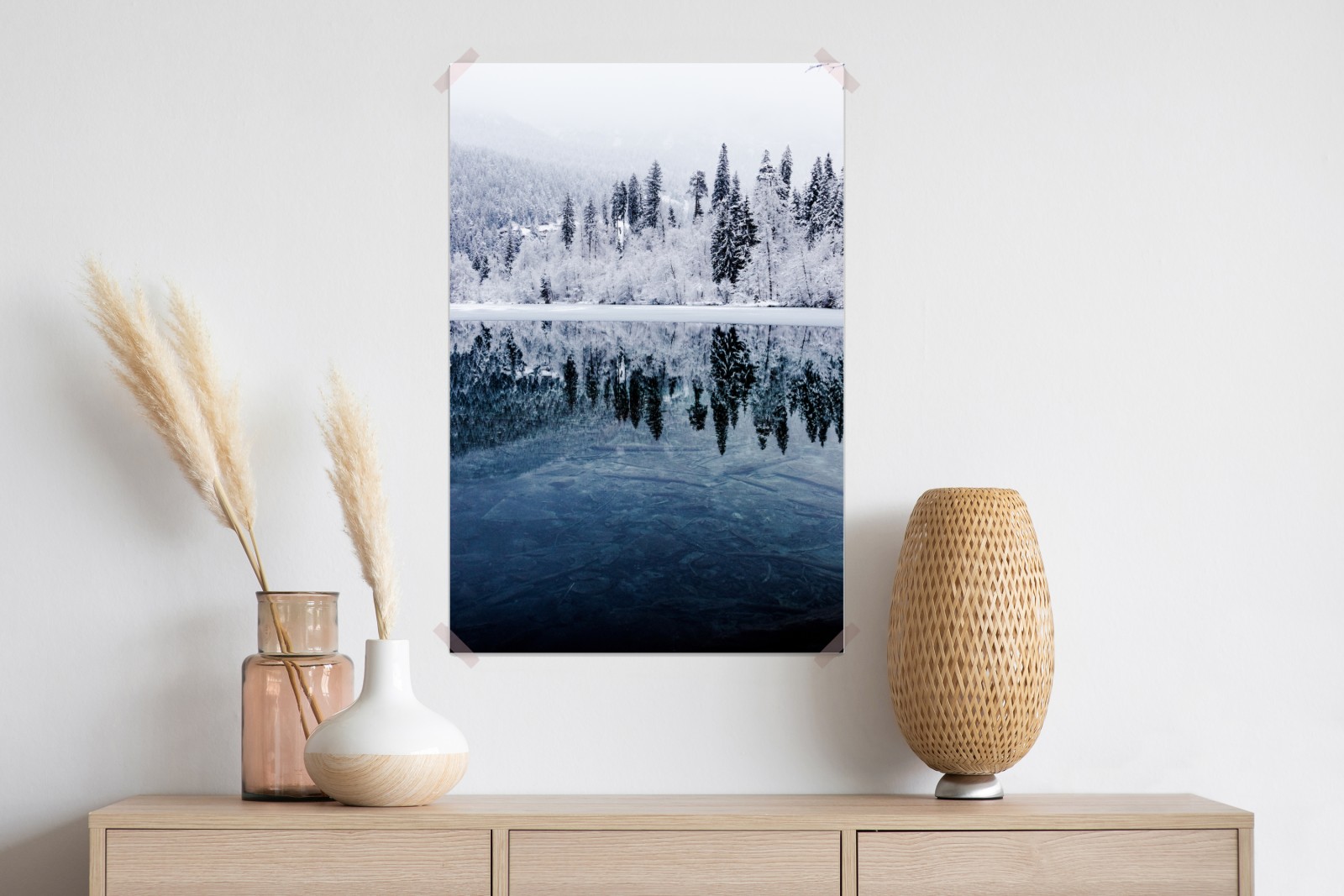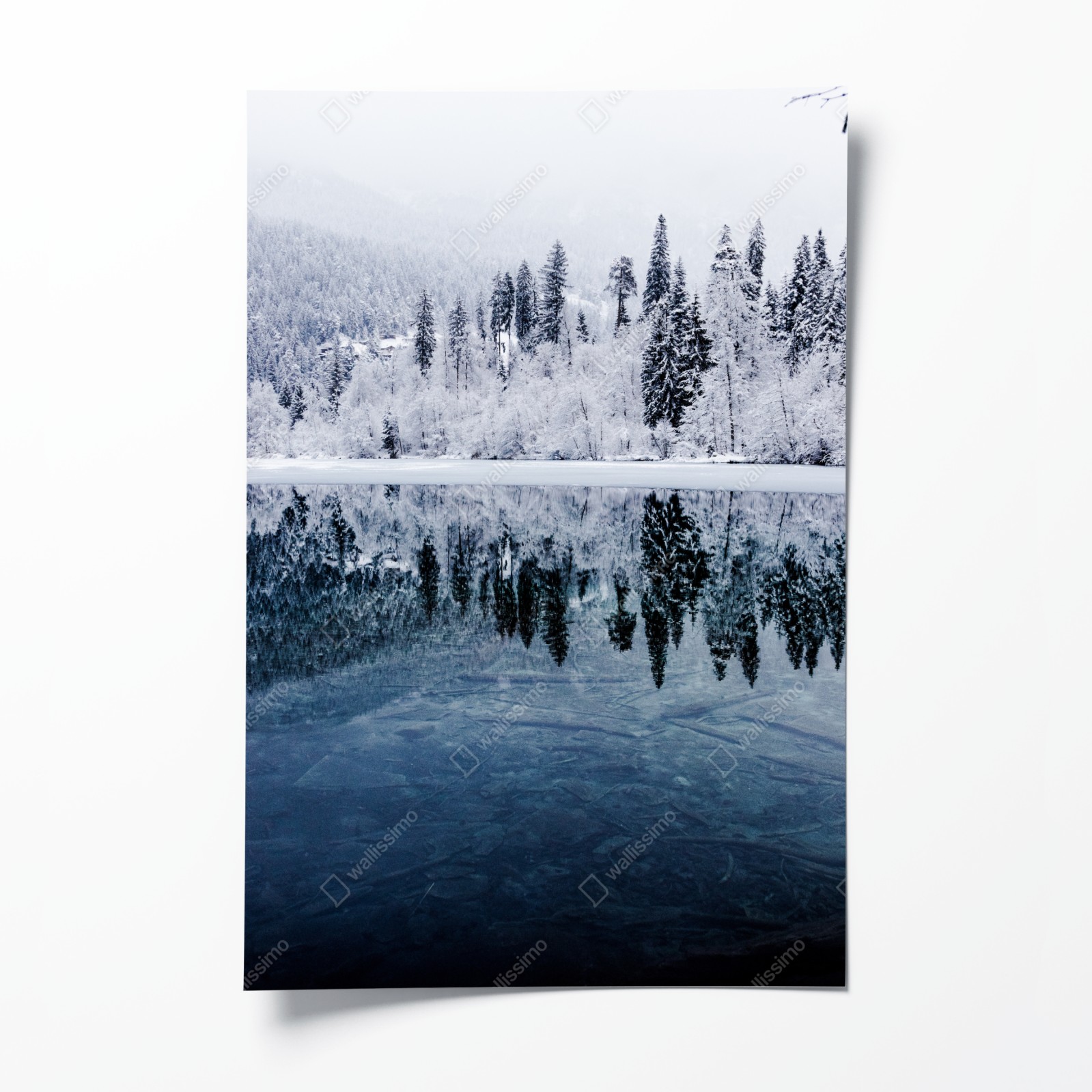 Plakat Zimowe jezioro z odbiciem w śnieżnym lesie