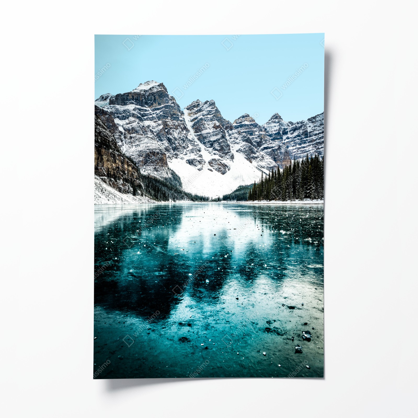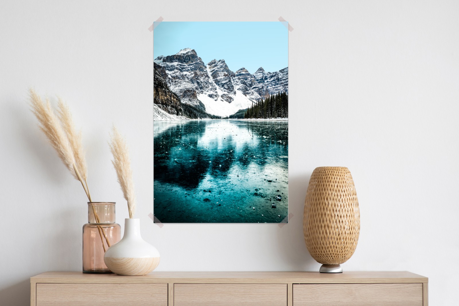 Wypełnij przestrzeń spokojnym widokiem gór z turkusowym, zimowym jeziorem i śnieżnymi szczytami.