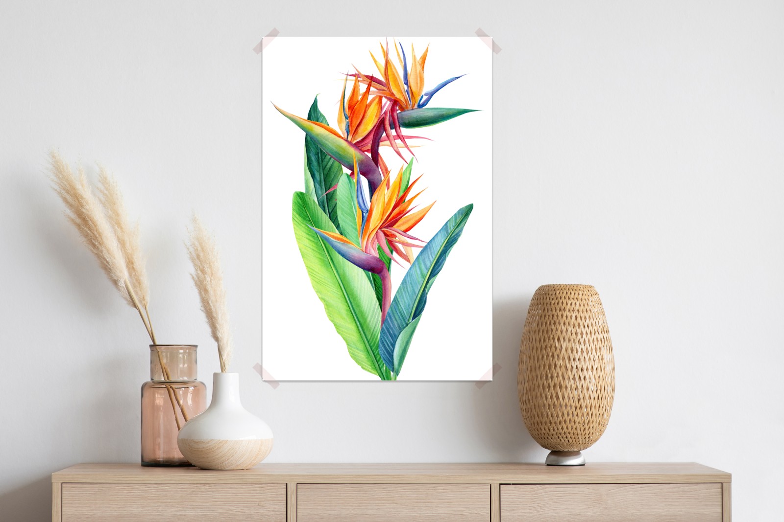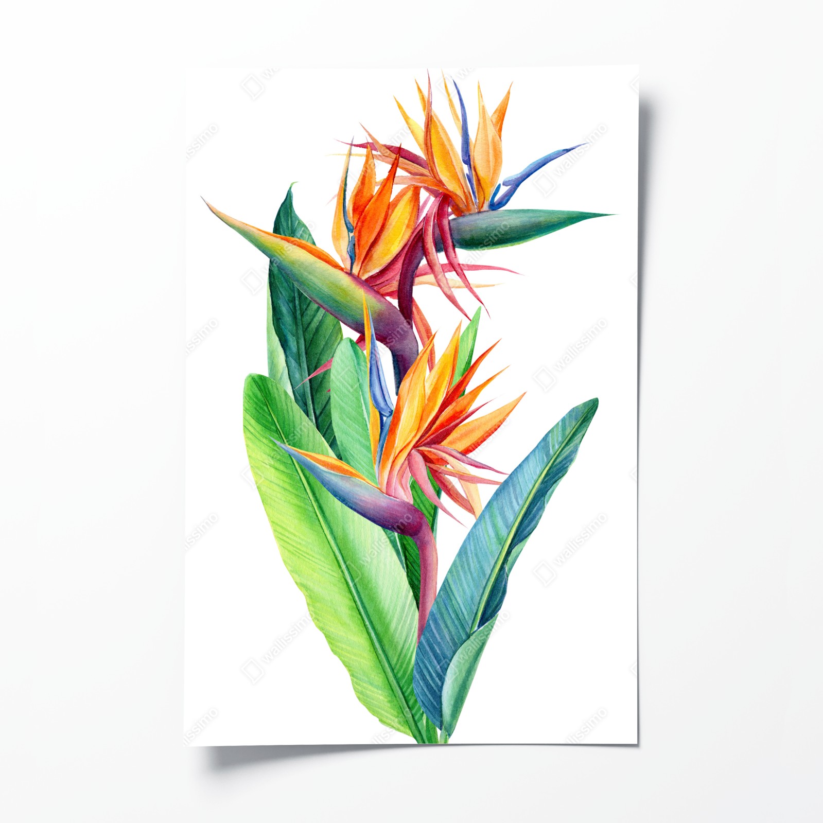 Wprowadź tropikalną elegancję do wnętrza dzięki tej kolorowej akwarelowej ilustracji strelicji, idealnej do naturalnej aranżacji.
