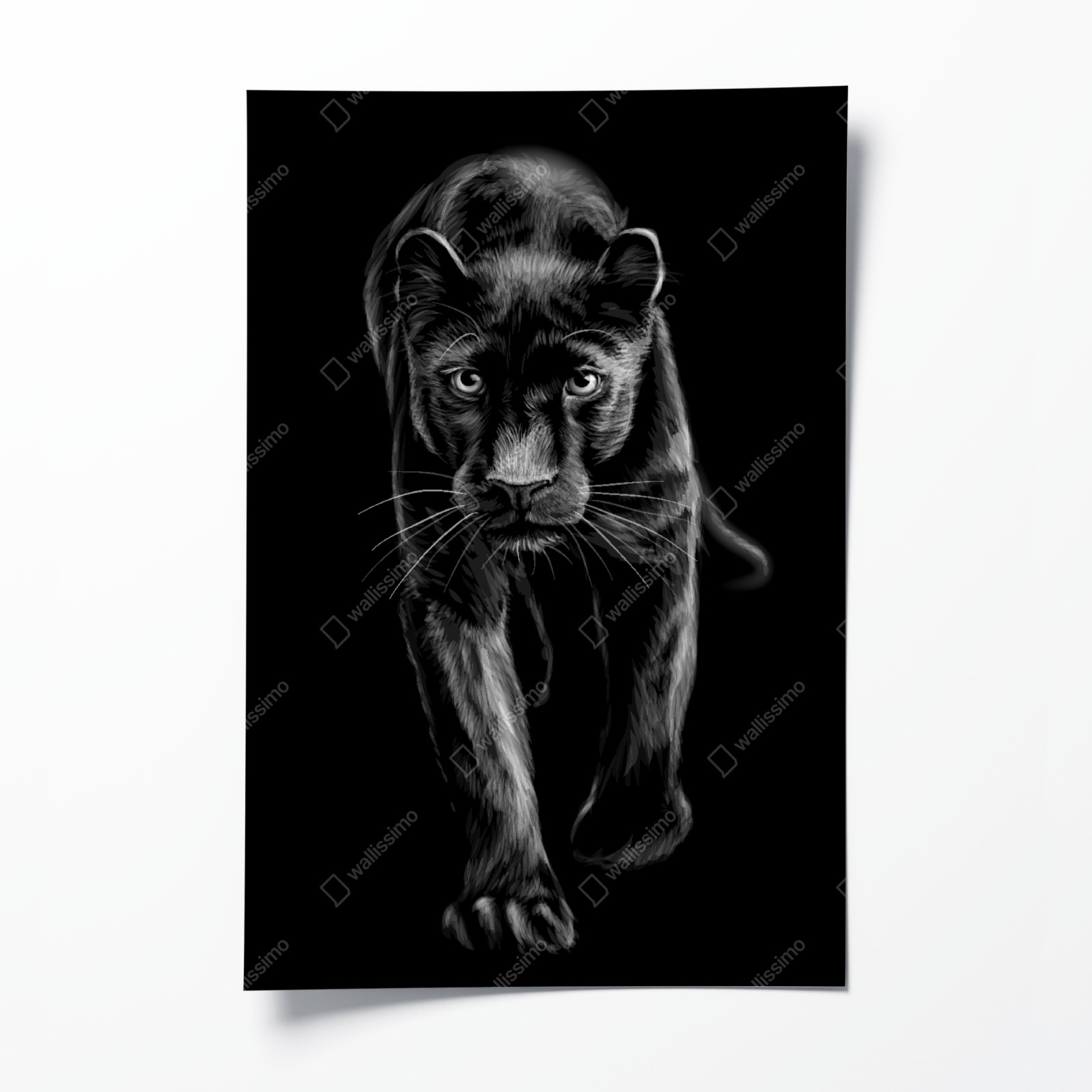 Wyrazista czarno-biała grafika pantery wprowadza dramatyczny akcent do nowoczesnych wnętrz i doskonale pasuje do salonu lub biura.