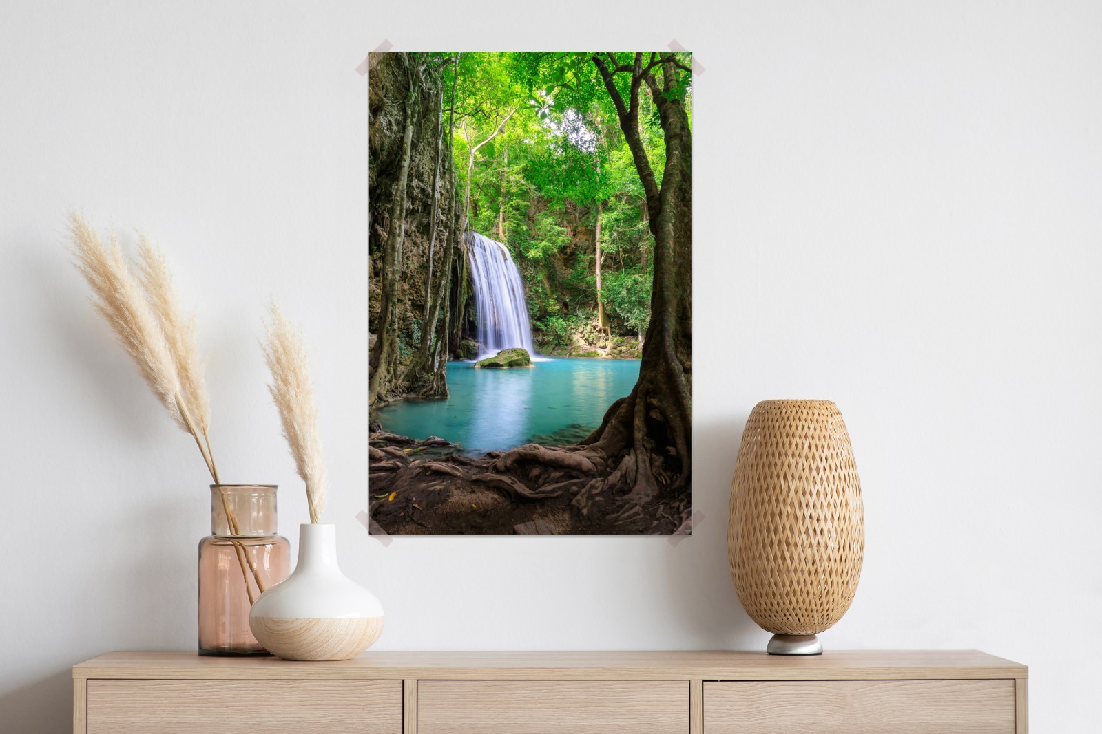 Dodaj tropikalnego spokoju do wnętrza dzięki widokowi wodospadu otoczonego bujną zielenią i turkusową wodą.